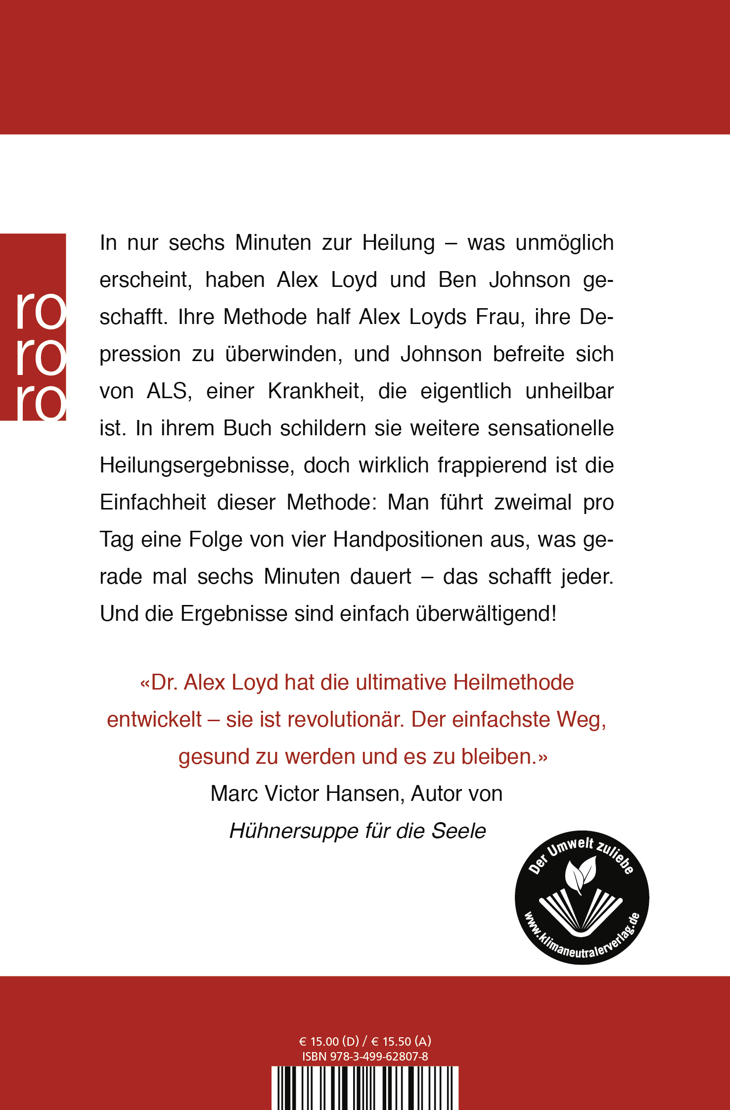 lt;p>In nur sechs Minuten zur Heilung - was unmöglich erscheint, haben Alex Loyd und Ben Johnson geschafft. Ihre Methode half Alex Loyds Frau, ihre Depression zu überwinden, und Johnson befreite sich von ALS, einer Krankheit, die eigentlich unheilbar ist. In ihrem Buch schildern sie weitere sensationelle Heilungsergebnisse, doch wirklich frappierend ist die Einfachheit dieser Methode: Man führt zweimal pro Tag eine Folge von vier Handpositionen aus, was gerade mal sechs Minuten dauert - das schafft jeder. Und die Ergebnisse sind einfach überwältigend!