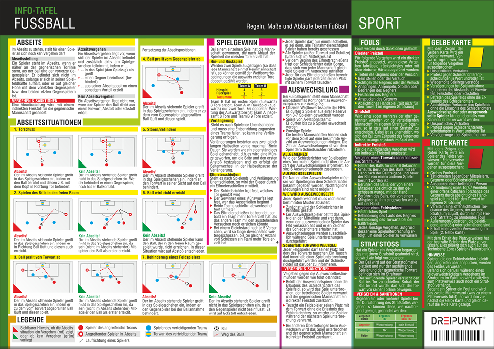 Auf dieser laminierten Info-Tafel sind alle Fußballregeln und alle wichtigen Maße das Spielfeld, das Tor und den Ball betreffend, zu finden. Durch anschauliche Illustrationen werden auch komplizierte Spielsituationen (siehe Abseitsregel) übersichtlich erklärt.