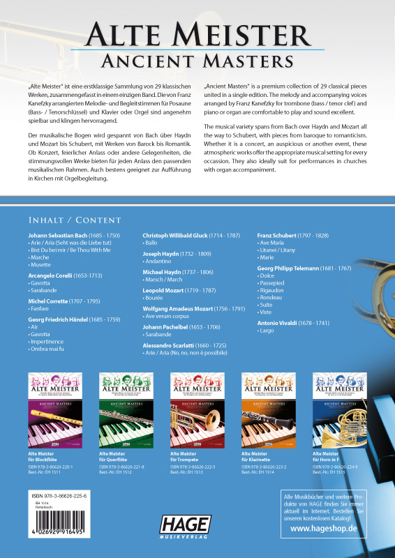 Der musikalische Bogen wird gespannt von Bach über Haydn und Mozart bis Schubert, mit Werken von Barock bis Romantik. Ob Konzert, feierlicher Anlass oder andere Gelegenheiten, die stimmungsvollen Werke bieten für jeden Anlass den passenden musikalischen Rahmen. Auch bestens geeignet zur Aufführung in Kirchen mit Orgelbegleitung.