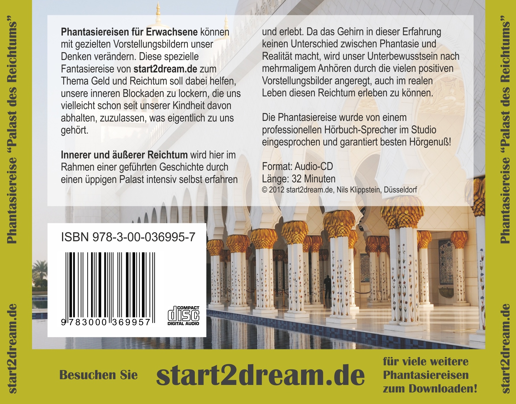 Innerer und äußerer Reichtum wird hier im Rahmen einer geführten Geschichte durch einen üppigen Palast intensiv selbst erfahren und erlebt. Da das Gehirn in dieser Erfahrung keinen Unterschied zwischen Phantasie und Realität macht, wird unser Unterbewusstsein nach mehrmaligem Anhören durch die vielen positiven Vorstellungsbilder angeregt, auch im realen Leben diesen Reichtum erleben zu können.