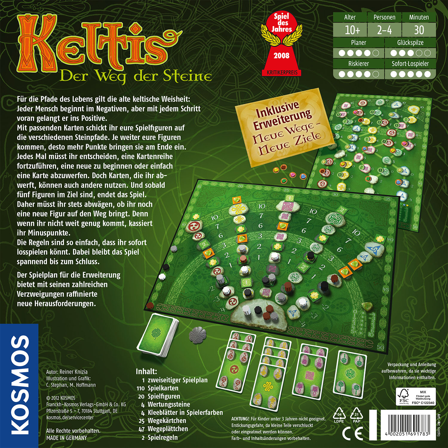 Auszeichnung: "Spiel des Jahres 2008". Mit passenden Karten schickt man seine Spielfiguren auf die Steinpfade. Je weiter sie kommen, desto mehr Punkte bringen sie ein. Sobald fünf Figuren im Ziel sind, endet das Spiel. Daher muss man stets abwägen, ob man eine neue Figur auf den Weg bringt, da man Minuspunkte kassiert, wenn sie nicht weit genug kommt. Wer eine noch größere Herausforderung sucht, dreht den Spielplan einfach um und spielt die Variante "Neue Wege - Neue Ziele". Für 2 - 4 Spieler ab 10 Jahren. Spieldauer: ca. 30 Minuten.