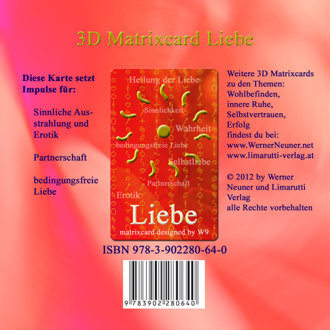 Auf dieser Karte siehst du Symbole, welche die Struktur der Heilen Matrix zum Thema Liebe darstellen. Diese Darstellung ergibt sich kreativ aus dem Wissen über den Goldenen Schnitt, die Heilige Geometrie und aus dem Wissen über die damit verbundenen Vorgänge in unserer DNA.