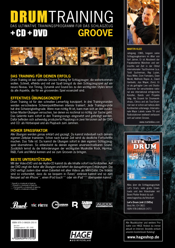 - Schnelle Fortschritte- Effektives Üben- Geringer Zeitaufwand- Timing, Dynamik & Sound, Styles, uvm.- Mit Playalongs und Übungen auf CD und DVDDas Training für deinen ErfolgDrum Training ist das optimale Groove-Training für Schlagzeuger, die weiterkommen wollen. Schnell, effektiv und mit viel Spaß bringst du dein Schlagzeugspiel auf ein neues Niveau. Von Timing, Dynamik und Sound bis zu den wichtigsten Styles lernst du alle Aspekte, die für ein grooviges Spiel essenziell sind.Effektives ÜbungskonzeptDrum Training ist für den schnellen Lernerfolg konzipiert. In drei Trainingsrunden werden verschiedene Schwerpunktthemen intensiv trainiert. Jede Trainingsrunde hat drei Schwierigkeitsgrade. Wenn man richtig fit ist, kann man sich an den zusätzlichen Master-Übungen versuchen, bei denen es nochmal so richtig zur Sache geht. Das Gelernte kann sofort in den Trainingssongs eingesetzt und gefestigt werden. Dafür befinden sich aufwendig produzierte Playalongs in zwei Versionen auf der DVD und CD: als Hörbeispiel und als Playback zum Jammen.Hoher SpassfaktorAlle Übungen werden genau erklärt und gezeigt. Du kannst individuell nach deinem eigenen Zeitplan trainieren. Schon nach kurzer Zeit wirst du deutliche Fortschritte machen. Das Tolle ist: Du kannst die Übungen sofort in dein eigenes Schlagzeugspiel übernehmen. So entwickelst du deinen eigenen unverwechselbaren Sound. Zusätzlich lernst du die Anforderungen der wichtigsten Musikstile Rock, Hip-Hop, R&B, Funk und Metal kennenund sie zum Grooven zu bringen.Beste UnterstützungMit der Video-DVD und der Audio-CD kannst du alle Inhalte sofort nachvollziehen. Auf der DVD zeigt der Autor alle Übungen und liefert die dazugehörigen Erklärungen. Die DVD verfügt zudem über einen Datenteil mit allen Videos als M4V-Datei. Die Videos sind so vorbereitet, dass du sie bequem in iTunes* einlesen kannst und so zum Beispiel auf ein iPhone**, einen iPod touch*** oder ein iPad**** überspielen kannst.* iTunes® is a trademark of Apple Inc.** iPhone® is a trademark of Apple Inc.*** iPod touch® is a trademark of Apple Inc.**** iPad® is a trademark of Apple Inc.