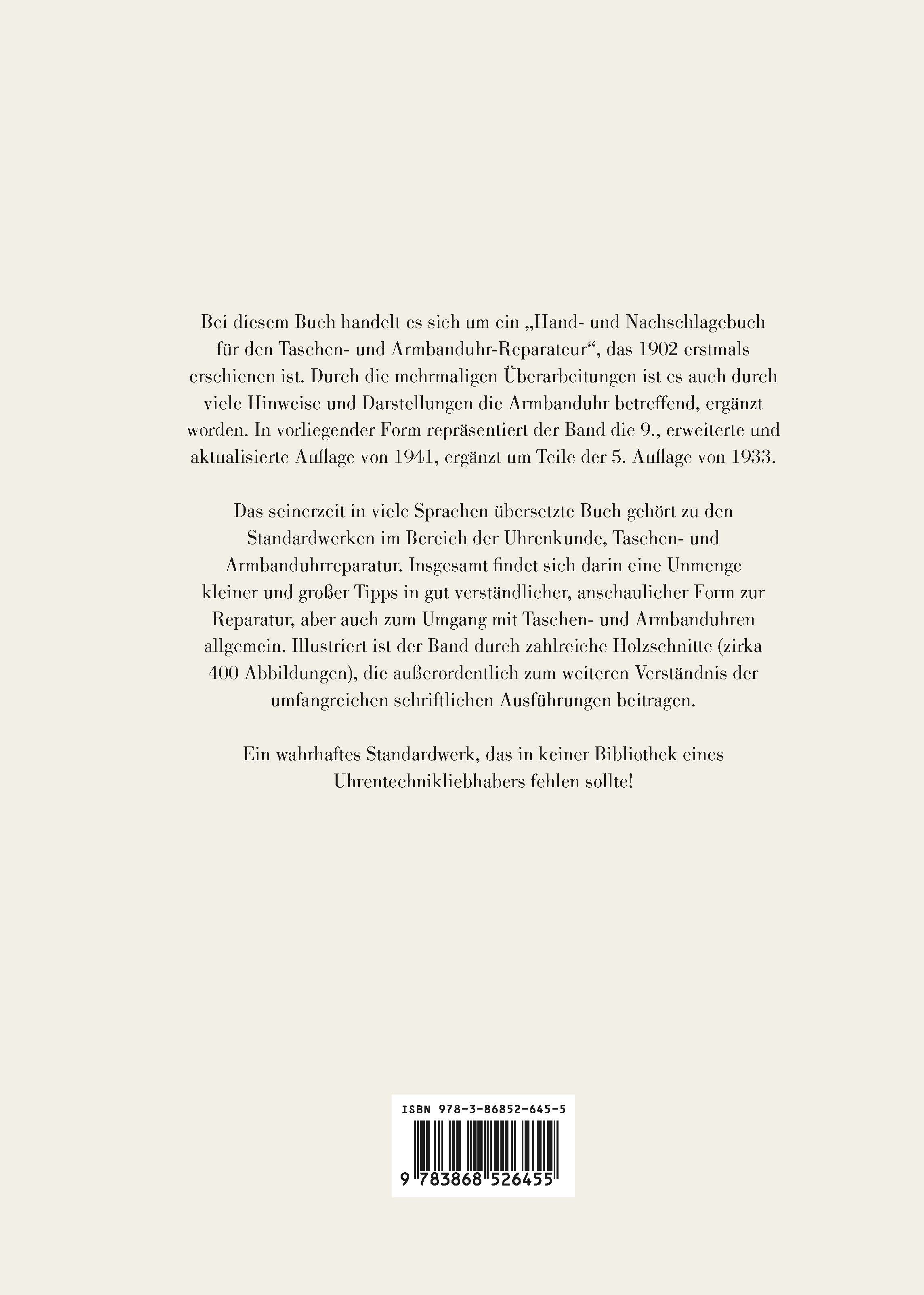 Das seinerzeit in viele Sprachen übersetzte Buch ist ein mittlerweile mehrfach aktualisiertes Reprint aus dem Jahre 1902 und gehört zu den Standardwerken im Bereich der Uhrenkunde, Taschen- und Armbanduhrreparatur. Eine Unmenge kleiner und großer Tipps in gut verständlicher, anschaulicher Form zur Reparatur, aber auch zum Umgang mit Taschen- und Armbanduhren allgemein machen dieses Buch für Laien wie für Profis interessant. Illustriert ist der Band durch zahlreiche Holzschnitte (zirka 400 Abbildungen), die zum weiteren Verständnis der umfangreichen schriftlichen Ausführungen beitragen. Ein wahrhaftes Standardwerk, das in keiner Bibliothek eines Uhrentechnikliebhabers fehlen sollte!