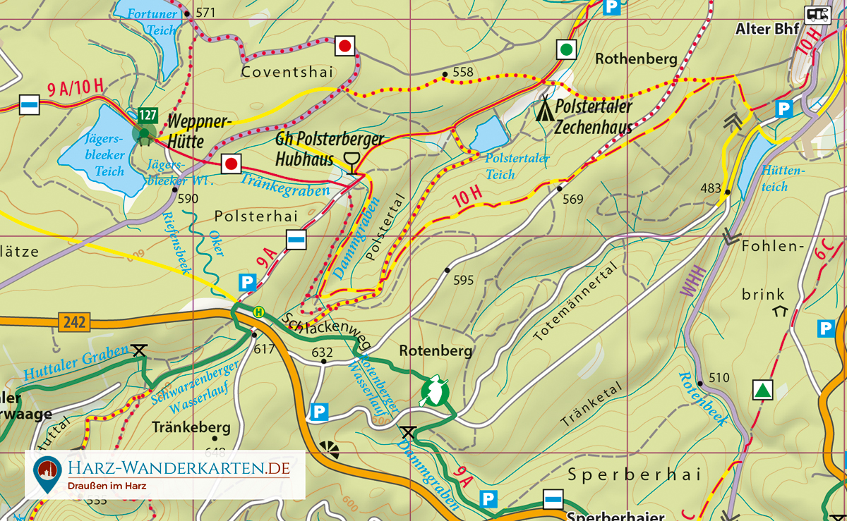 - Harzklub-Rundwege. In enger Zusammenarbeit mit dem Harzklub haben wir die neuen Rundwege mit in die Karte aufgenommen. Sie werden mit einer durchgehenden roten Linie dargestellt.