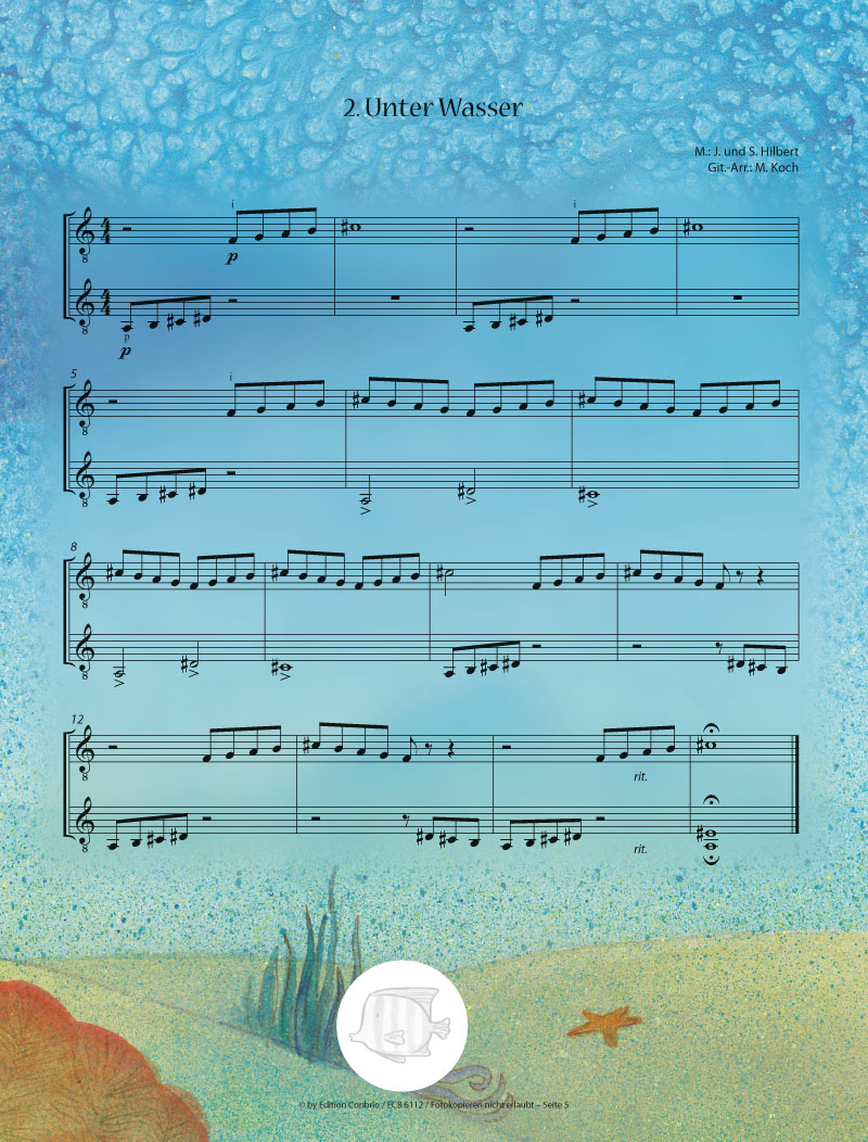 In der farbenprächtigen Unterwasser-Welt sucht ein heranwachsender Einsiedlerkrebs ein neues Zuhause. Die Stücke, meist zum Mitsingen, spiegeln die faszinierende Tiefseestimmung wundervoll wider. Die Ausgabe enthält Belohnungsaufkleber! Wenn ein Stück gut geübt ist, erhält der Schüler einen Aufkleber. Der Clou: Erst mit dem Sticker wird das farbenfrohe Bild vollständig. "Unter Wasser" ist auch für Klavier (ECB 6044) und Blockflöten (ECB 6118) erhältlich.