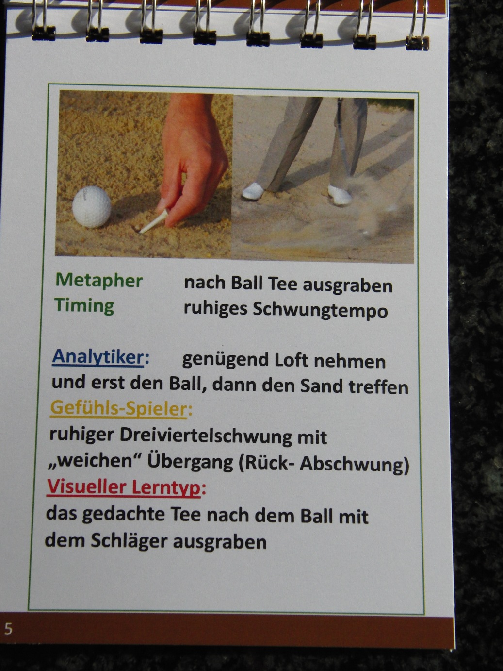 Er beschreibt auf 53 Seiten mit 148 Farbfotos und in Stichworten die Schlagtechniken Putt, Chip-Putt, Chip, kurzer und langer Pitch, Grünbunkerschlag, Fairwaybunkerschlag, voller Schwung.