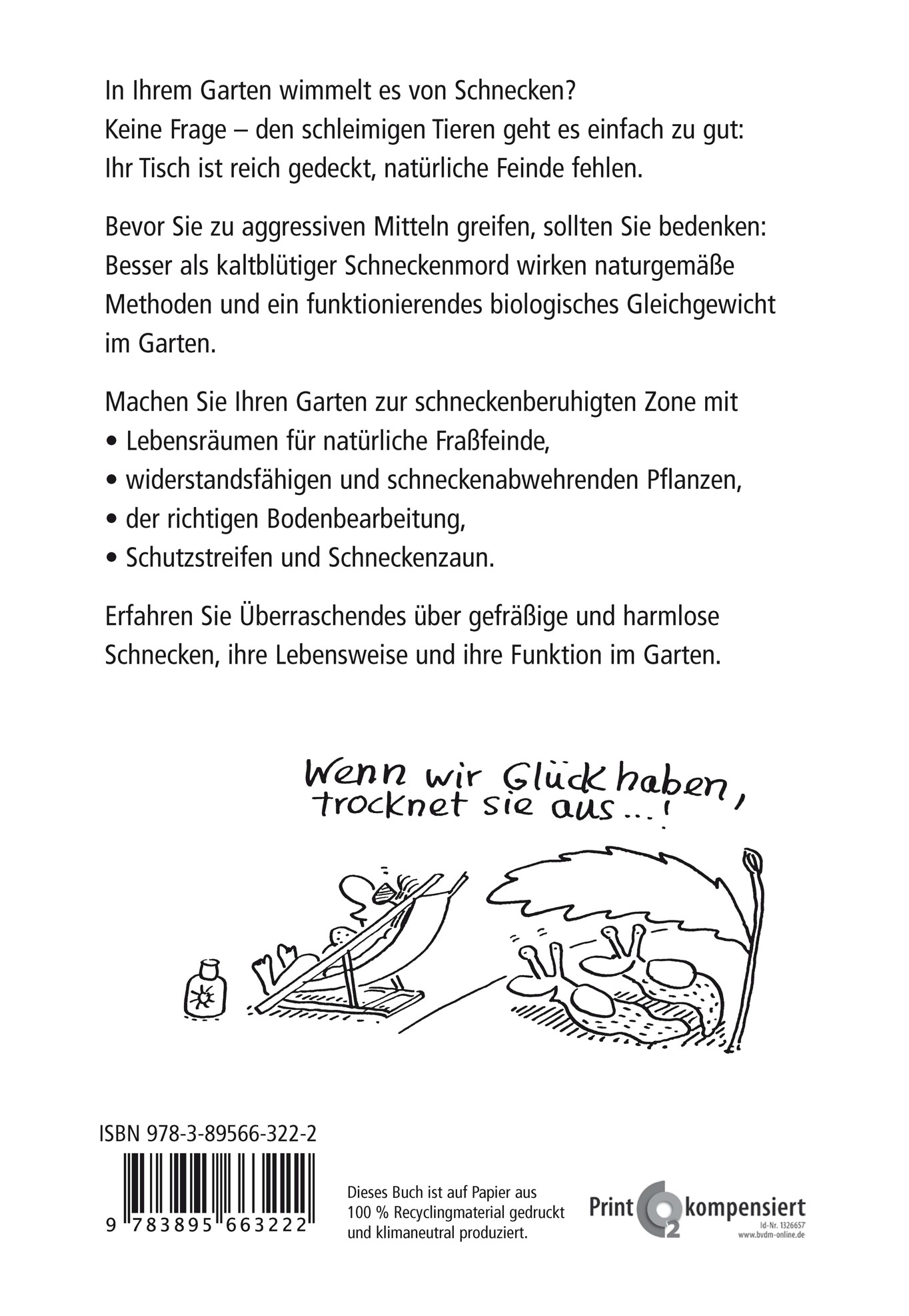 Oh je, schon wieder ratzekahl gefressen! Über Nacht verputzen Schnecken den Salat. Auch im Biogarten sind die Kriecher und ihre Fresslust nicht immer gern gesehen. Doch kaltblütiger Schneckenmord und giftige Mittel müssen nicht sein: Viel nachhaltiger wirkt eine naturnahe Gartengestaltung. Leicht verständlich und praxisnah ebnet dieses Buch den Weg zum schneckenberuhigten Garten. Eine Fülle erprobter Anregungen lädt zum Ausprobieren ein. Von guter Pflanzenauswahl über Bodenpflege bis hin zur Gestaltung von Lebensräumen für natürliche Fraßfeinde reicht das vorbeugende Repertoire. Bei akutem Überfall helfen Tipps für selbst gebaute Schneckenzäune und Pflanzenbrühen zur Abwehr. Witzig illustriert mit Cartoons von Renate Alf, greift die erweiterte Neuauflage dieses Buches tatkräftig unter die Arme, wenn es um Erste Hilfe für schneckengeplagte Gärtner und ihre Schützlinge geht. Darüber hinaus bietet der Ratgeber rechtzeitig zu Beginn der Gartensaison sowohl Wissenswertes rund um Schnecken als auch kurzweiliges Lesevergnügen.