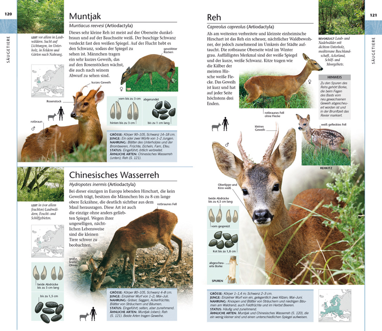 Ein großes Foto zeigt die jeweiligen Arten in ihrer natürlichen Umgebung. Wie der typische Lebensraum aussieht, verdeutlicht eine weitere kleine Abbildung. Eine Verbreitungskarte, Anmerkungen zu auffallenden Merkmalen und Eigenschaften sowie Beschreibungen typischer Spuren helfen bei der genauen Bestimmung. Wichtige Informationen über Körpergröße, Vermehrungsrate und Ernährung vermitteln ein genaues Gesamtbild der Art. Angaben zum Status der Bedrohung sowie über ähnliche Arten, die mit der beschriebenen verwechselt werden könnten, vervollständigen den Eintrag. Das handliche Format ist perfekt für unterwegs!