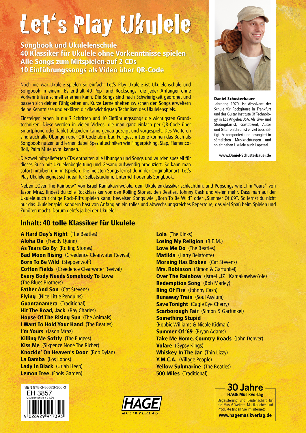 Noch nie war Ukulele spielen so einfach: Let's Play Ukulele ist Ukulelenschule und Songbook in einem. Es enthält 40 Pop- und Rocksongs, die jeder Anfänger ohne Vorkenntnisse schnell erlernen kann. Die Songs sind nach Schwierigkeit geordnet und passen sich deinen Fähigkeiten an. Kurze Lerneinheiten zwischen den Songs erweitern deine Kenntnisse und erklären dir die wichtigsten Techniken des Ukulelenspiels.Einsteiger lernen in nur 7 Schritten und 10 Einführungssongs die wichtigsten Grundtechniken. Diese werden in vielen Videos, die man ganz einfach per QR-Code über Smartphone oder Tablet abspielen kann, genau gezeigt und vorgespielt. Des Weiteren sind auch alle Übungen über QR-Code abrufbar. Fortgeschrittene können das Buch als Songbook nutzen und lernen dabei Spezialtechniken wie Fingerpicking, Slap, Flamenco-Roll, Palm Mute uvm. kennen.Die zwei mitgelieferten CDs enthalten alle Übungen und Songs und wurden speziell für dieses Buch mit Ukulelenbegleitung und Gesang aufwendig produziert. So kann man sofort mitüben und mitspielen. Die meisten Songs lernst du in der Originaltonart. Let's Play Ukulele eignet sich ideal für Selbststudium, Unterricht oder als Songbook. Neben "Over The Rainbow" von Israel Kamakawiwo'ole, dem Ukulelenklassiker schlechthin, und Popsongs wie "I'm Yours" von Jason Mraz, findest du tolle Rockklassiker von den Rolling Stones, den Beatles, Johnny Cash und vielen mehr. Dass man auf der Ukulele auch richtige Rock-Riffs spielen kann, beweisen Songs wie "Born To Be Wild" oder "Summer Of 69". So lernst du nicht nur das Ukulelenspiel, sondern hast von Anfang an ein tolles und abwechslungsreiches Repertoire, das viel Spaß beim Spielen und Zuhören macht. Darum geht's ja bei der Ukulele!