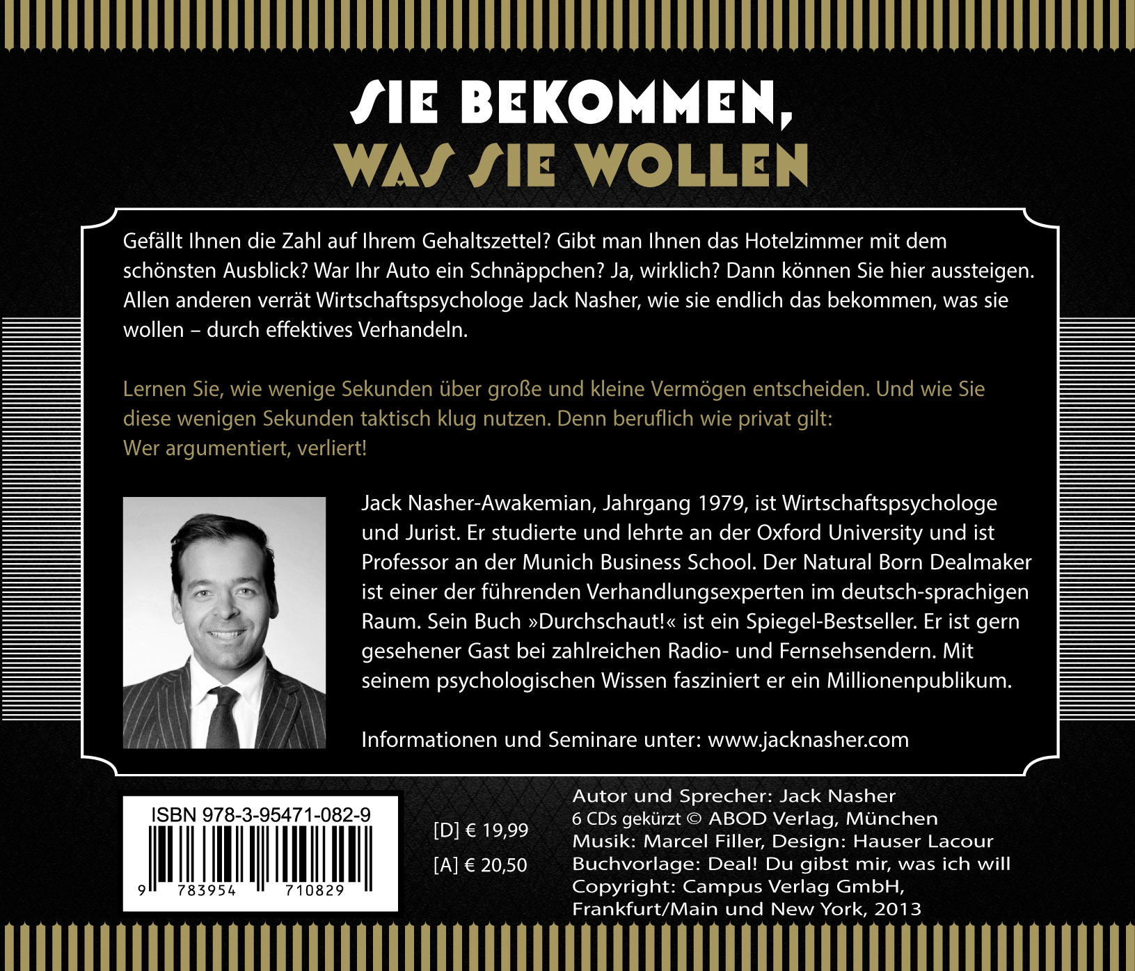 Dr. Jack Nasher, geboren 1979, ist Wirtschaftspsychologe und Jurist. Er lehrt "Management Studies" an der britischen Eliteuniversität Oxford und ist als Vortragsredner in der ganzen Welt unterwegs. Neben seiner Profession als Managementberater ist er Mentalist und faszinierte mit seinen Sinnestäuschungen ein Millionenpublikum. Jack Nasher lebt in München.