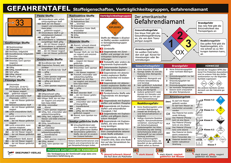 Zweiseitige, hochwertig laminierte Info-Tafel mit allen wichtigen Informationen zum Lesen der Gefahrentafel z.B. an Fahrzeugen. Optimal geeignet zur Vorbereitung z.B. vor einem Gefahrgutlehrgang oder als übersichtliche Lernhilfe.