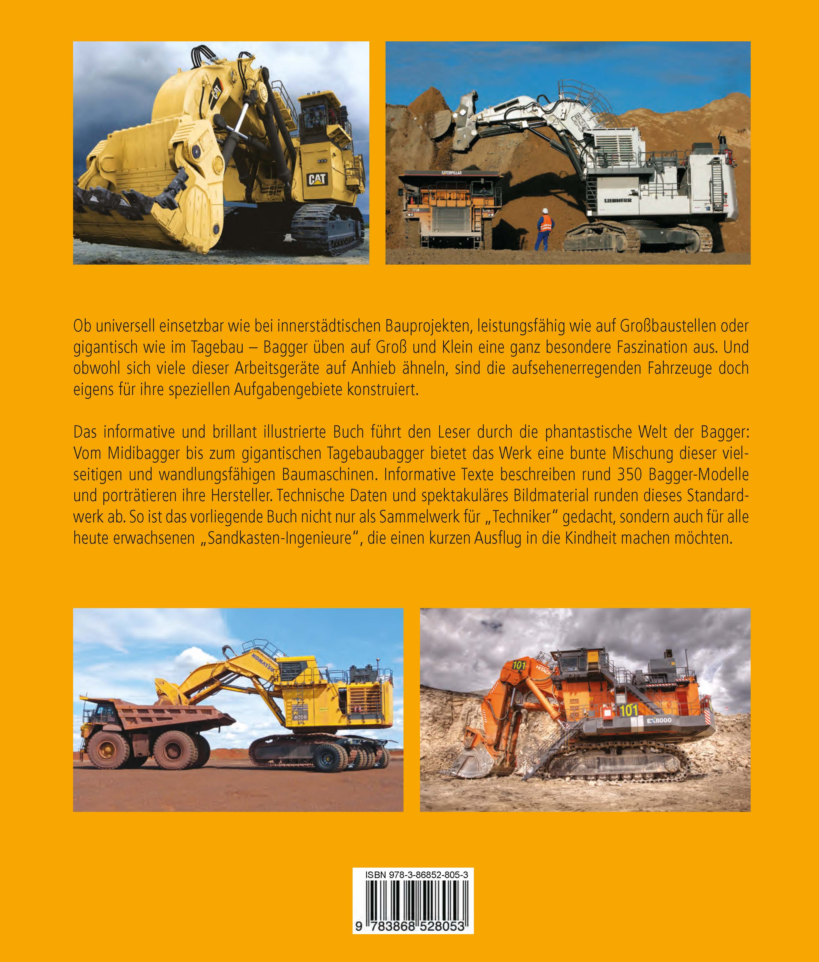 Faszination Bagger - informativ und brillant Illustriert!Ob universell einsetzbar wie bei innerstädtischen Bauprojekten, leistungsfähig wie auf Großbaustellen oder gigantisch wie im Tagebau - Bagger üben auf Groß und Klein eine ganz besondere Faszination aus. Und obwohl sich viele dieser Arbeitsgeräte auf Anhieb ähneln, sind die aufsehenerregenden Fahrzeuge doch eigens für ihre speziellen Aufgabengebiete konstruiert. Das informative und brillant illustrierte Buch führt den Leser durch die phantastische Welt der Bagger: Vom Midibagger bis zum gigantischen Tagebaubagger bietet das Werk eine bunte Mischung dieser vielseitigen und wandlungsfähigen Baumaschinen. Informative Texte beschreiben rund 350 Bagger-Modelle und porträtieren ihre Hersteller. Technische Daten und spektakuläres Bildmaterial runden dieses Standardwerk ab. So ist das vorliegende Buch nicht nur als Sammelwerk für "Techniker" gedacht, sondern auch für alle heute erwachsenen "Sandkasten-Ingenieure", die einen kurzen Ausflug in die Kindheit machen möchten.Fazit: Über 250 Seiten mit rund 350 Bagger-Modellen mit technischen Daten, 700 spektakuläre Bagger-Bilder - dieser kiloschwere Bildband für noch nicht einmal 15 Euro ist eine wahre Fundgrube und das ultimative Geschenkbuch für große und kleine Bagger-Freunde!