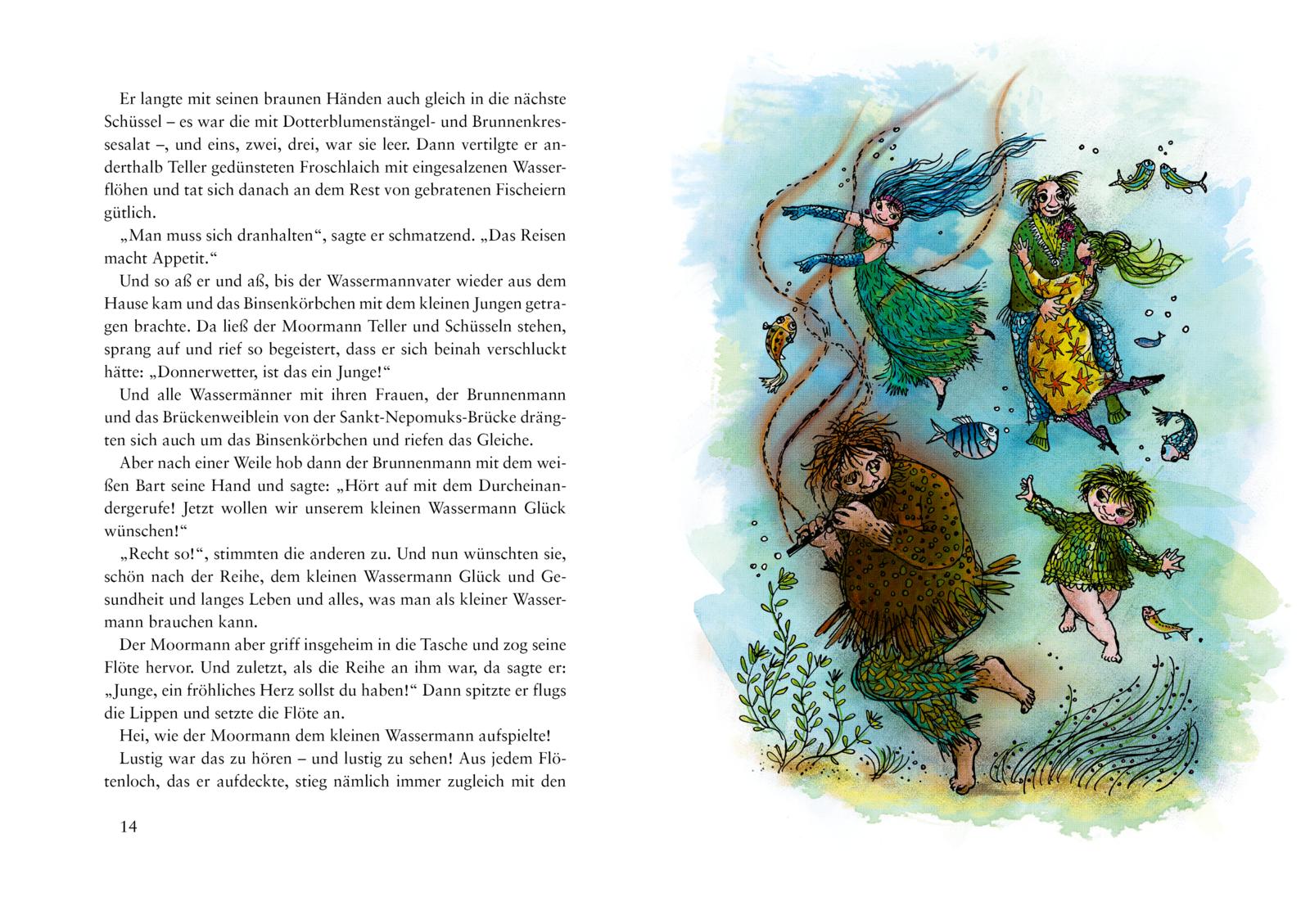 Eines Tages bekommt die Wassermannsfamilie im Mühlenweiher Nachwuchs. Der kleine Wassermann mit grünen Haaren und Schwimmhäuten zwischen den Zehen gedeiht prächtig und findet überall Freunde. Bald geht der kleine Wassermann mit seinem Vater oder mit seinem Freund, dem Karpfen Cyprinus, auf Entdeckungsreise. Er lernt sich im Weiher zurechtzufinden und erlebt tagtäglich neue Abenteuer, bis es Winter wird und das Eis den Mühlenweiher wieder zudeckt.
