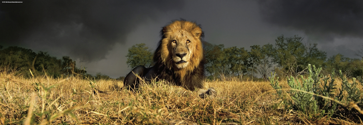 Spannung extrem: Der König der Steppe leuchtet in seiner ganzen Stärke in den letzten Sonnenstrahlen vor dem Unwetter, das im Hintergrund den Himmel verdunkelt.