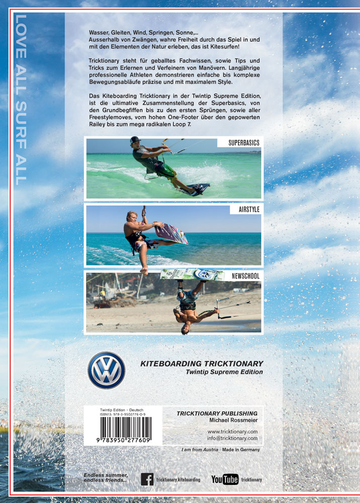 Das Kiteboarding Tricktionary in der Twintip Supreme Edition, ist die ultimative Zusammenstellung der Superbasics, von den Grundbegfiffen bis zu den ersten Sprüngen, sowie aller Freestylemoves, vom hohen One-Footer über den gepowerten Railey bis zum mega radikalen Loop 7.