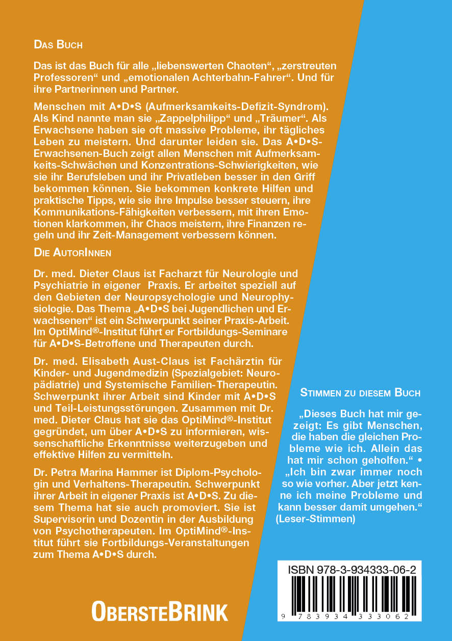 Sie bekommen konkrete Hilfen und praktische Tipps, wie Sie Ihre Impulse besser steuern, Ihre Kommunikations-Fähigkeiten verbessern, mit Ihren Emotionen klarkommen, Ihr Chaos meistern, Ihre Finanzen regeln und Ihr Zeit-Mamagement verbessern können.