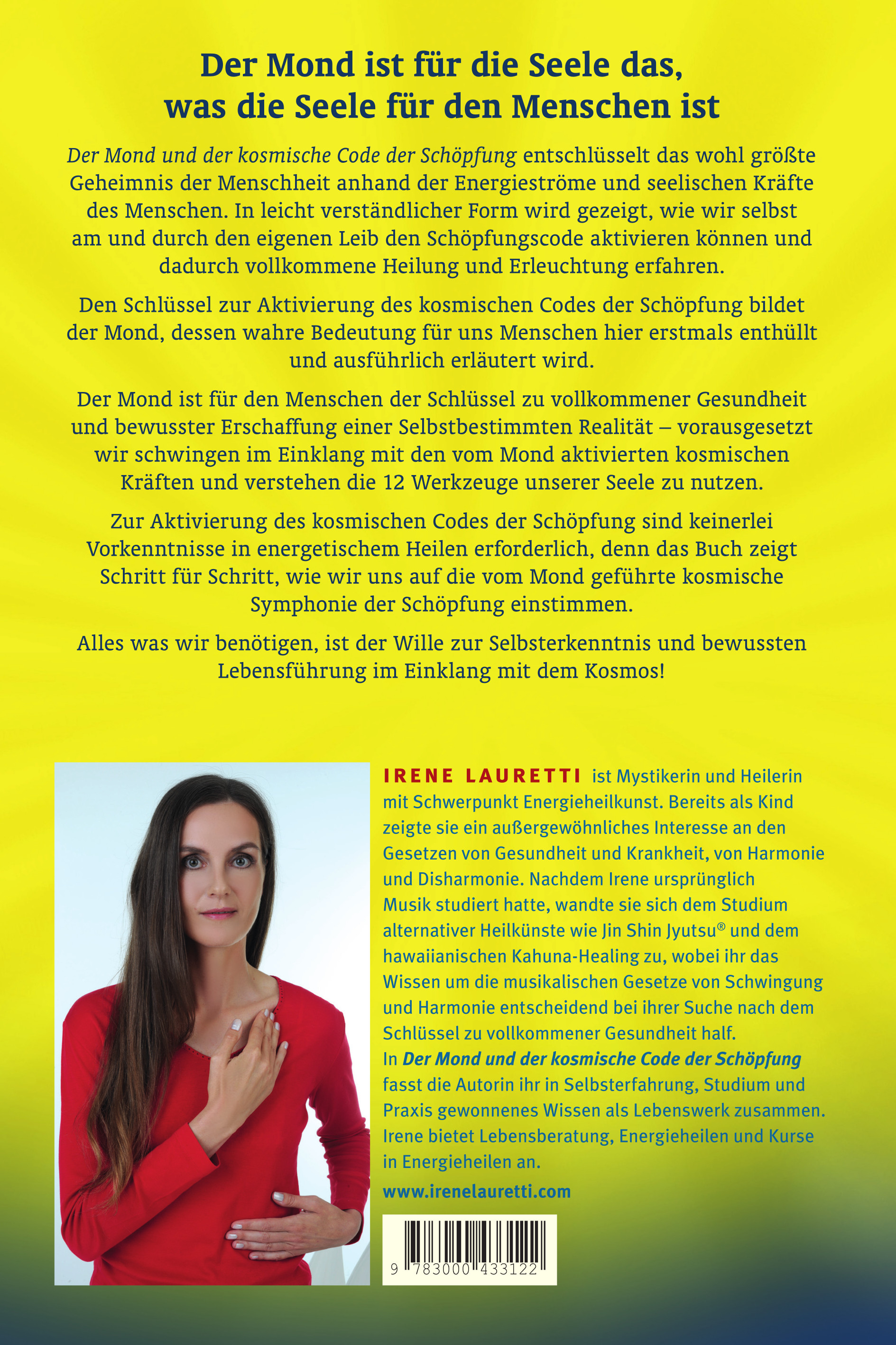 Irene Lauretti ist Mystikerin und Heilerin mit Schwerpunkt Energieheilkunst. Bereits als Kind zeigte sie ein außergewöhnliches Interesse an den Gesetzen von Gesundheit und Krankheit, von Harmonie und Disharmonie. Nachdem sie ursprünglich Musik studiert hatte, wandte sie sich dem Studium alternativer Heilkünste wie Jin Shin Jyutsu und dem hawaiianischen Kahuna-Healing zu, wobei ihr das Wissen musikalischer Gesetze von Schwingung und Harmonie entscheidend bei ihrer Suche nach dem Schlüssel zu vollkommener Gesundheit half. In Der Mond und der kosmische Code der Schöpfung fasst die Autorin ihr in Selbsterfahrung, Studium und Praxis gewonnenes Wissen als Lebenswerk zusammen. Irene Lauretti bietet Lebensberatung, Energieheilen und Kurse in Energieheilen an.