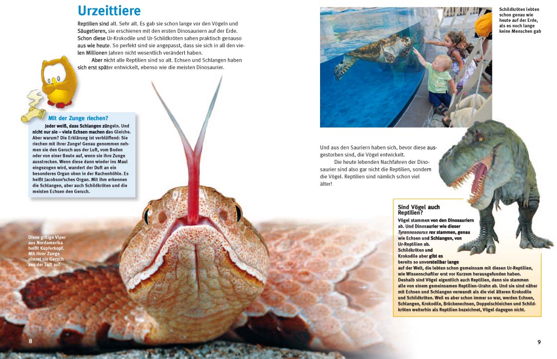 Und noch viel mehr Spannendes gibt es zu berichten: Was sind Reptilien, wo leben und was fressen sie? Können alle Reptilien ihren Schwanz abwerfen - und warum tun sie das überhaupt? Wozu haben Reptilien Schuppen? Welche Reptilien sind giftig - und welche tun nur so?
