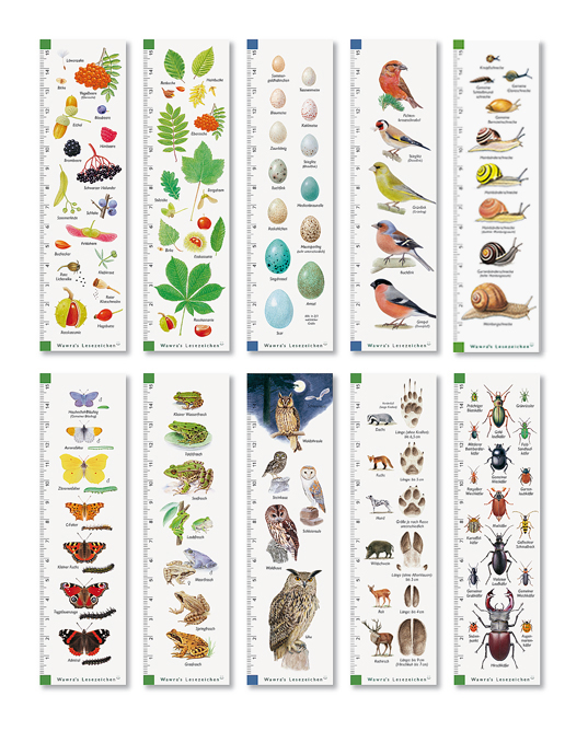 10 illustrierte Lesezeichen mit Millimetermaß (Set in Folientasche) - mit Motiven aus der heimischen Natur.