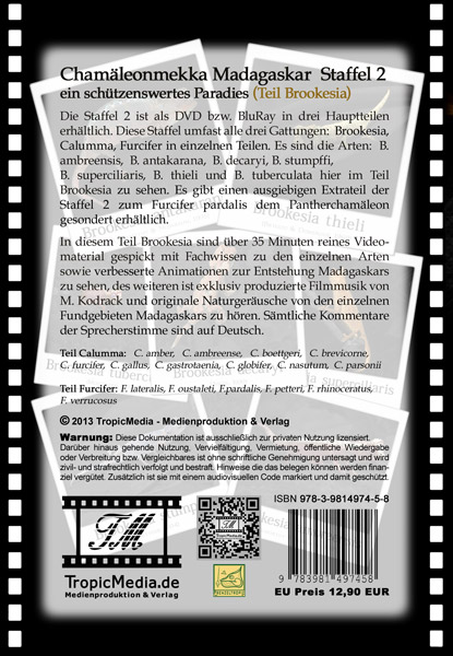 Die Staffel 2 ist als DVD bzw. BluRay in drei Hauptteilen erhältlich. Diese Staffel umfast alle drei Gattungen: Brookesia, Calumma, Furcifer in einzelnen Teilen. Es sind die Arten: B. ambreensis, B. antakarana, B. decaryi, B. stumpffi, B. superciliaris, B. thieli und B. tuberculata hier im Teil Brookesia zu sehen. Es gibt einen ausgiebigen Extrateil der Staffel 2 zum Furcifer pardalis dem Pantherchamäleon gesondert erhältlich. In diesem Teil Brookesia sind über 35 Minuten reines Video- material gespickt mit Fachwissen zu den einzelnen Arten sowie verbesserte Animationen zur Entstehung Madagaskars zu sehen, des weiteren ist exklusiv produzierte Filmmusik von M. Kodrack und originale Naturgeräusche von den einzelnen Fundgebieten Madagaskars zu hören. Sämtliche Kommentare der Sprecherstimme sind auf Deutsch. Teil Calumma: C. amber, C. ambreense, C. boettgeri, C. brevicorne, C. furcifer, C. gallus, C. gastrotaenia, C. globifer, C. nasutum, C. parsonii Teil Furcifer: F. lateralis, F. oustaleti, F.pardalis, F. petteri, F. rhinoceratus, F. Verrucosus