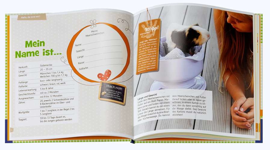Jetzt wird es für Kinder noch spannender und interessanter, Zeit mit ihren Meerschweinchen zu verbringen. Denn was ist schöner, als das Zusammensein mit seinem Liebling in einem ganz eigenen Album festzuhalten? Und ganz nebenbei erfährt man alles, was man wissen muss, um sein Meerschweinchen zu verstehen und richtig zu versorgen.
