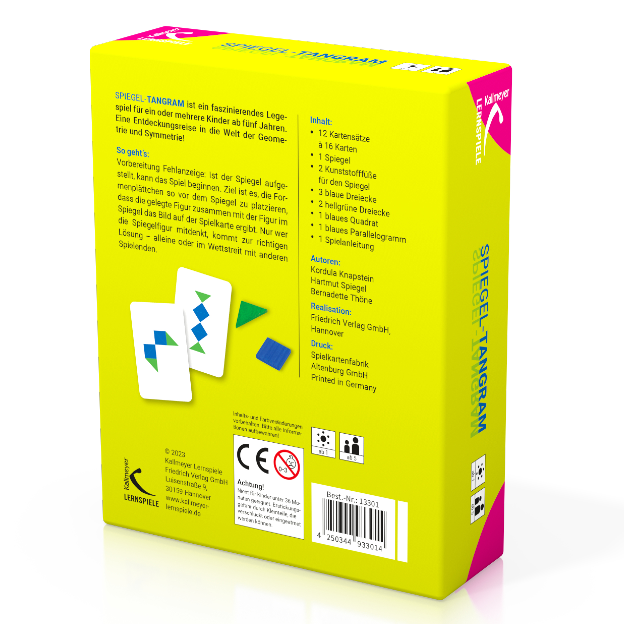 Symmetrische Formen spielerisch entdeckenSpiegel-Tangram ist ein faszinierendes Legespiel für ein oder mehrere Kinder ab fünf Jahren. Es dient der intensiven Auseinandersetzung mit symmetrischen Figuren und geometrischen Formen.Ziel ist es, die Formenplättchen so vor einem Spiegel zu platzieren, dass die gelegte Figur zusammen mit der Figur im Spiegel das Bild auf einer Spielkarte ergibt. Wenn mehreren Kindern das Erspiegeln der Figuren leicht gelingt, können sie mit den Karten ein Wettspiel durchführen. Dazu können Sie weitere Ersatzsteine + Spiegel zum Spiel dazu bestellen! Der Kartenstapel wird dann verdeckt auf den Tisch gelegt und eine Karte wird aufgedeckt. Das Kind, das als erstes die Zielfigur erspiegelt, erhält die Karte. Gewonnen hat, wer am Ende die meisten Karten besitzt!Was die Kinder dabei lernen:Die Kinder entdecken, dass jede Zielfigur eine Symmetrieachse hat, wobei die Achse sowohl senkrecht bzw. waagerecht als auch diagonal verlaufen kann.Sie erkennen, dass durch Umsetzen des Spiegels immer neue Figuren entstehen.Geometrische Formen können zu neuen Formen zusammengelegt werden: Aus zwei Dreiecken wird beispielsweise ein großes Dreieck, ein Quadrat oder ein Parallelogramm. Inhalt:12 Kartensätze à 16 Karten1 Spiegel mit Kunststofffüßen7 geometrische Formen (verschiedene Dreiecke, 1 Quadrat und 1 Parallelogramm)Lehrerkommentar
