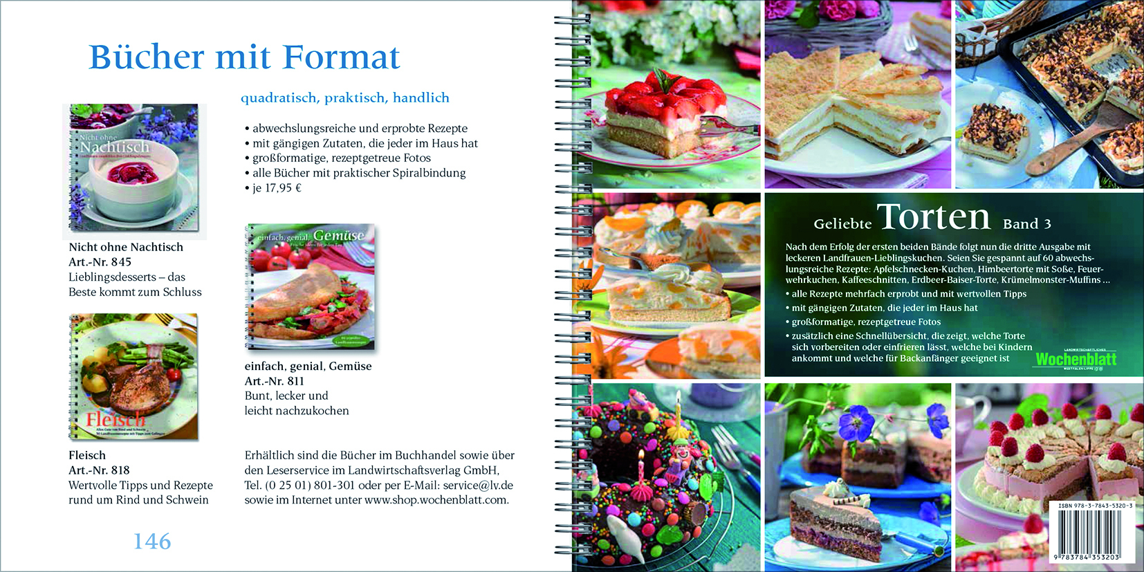 Nach dem Erfolg der ersten beiden Wochenblatt-Backbücher "Geliebte Torten" erscheint zu Ostern 2014 der dritte Band. Darin verraten 60 weitere Landfrauen ihre Lieblingsrezepte rund ums Backen.