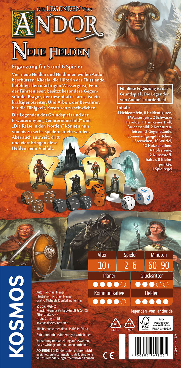 Ergänzung für 5 - 6 Spieler: Vier neue Helden stehen zur Auswahl, mit denen sich alle Legenden des Grundspiels und der Erweiterung "Der Sternenschild" nun auch zu fünft oder sechst spielen lassen. Aber auch bei Runden mit zwei bis vier Spielern können die neuen Helden zum Einsatz kommen und für mehr Spannung und Abwechslung sorgen. Spieldauer: ca. 60 - 90 Minuten.