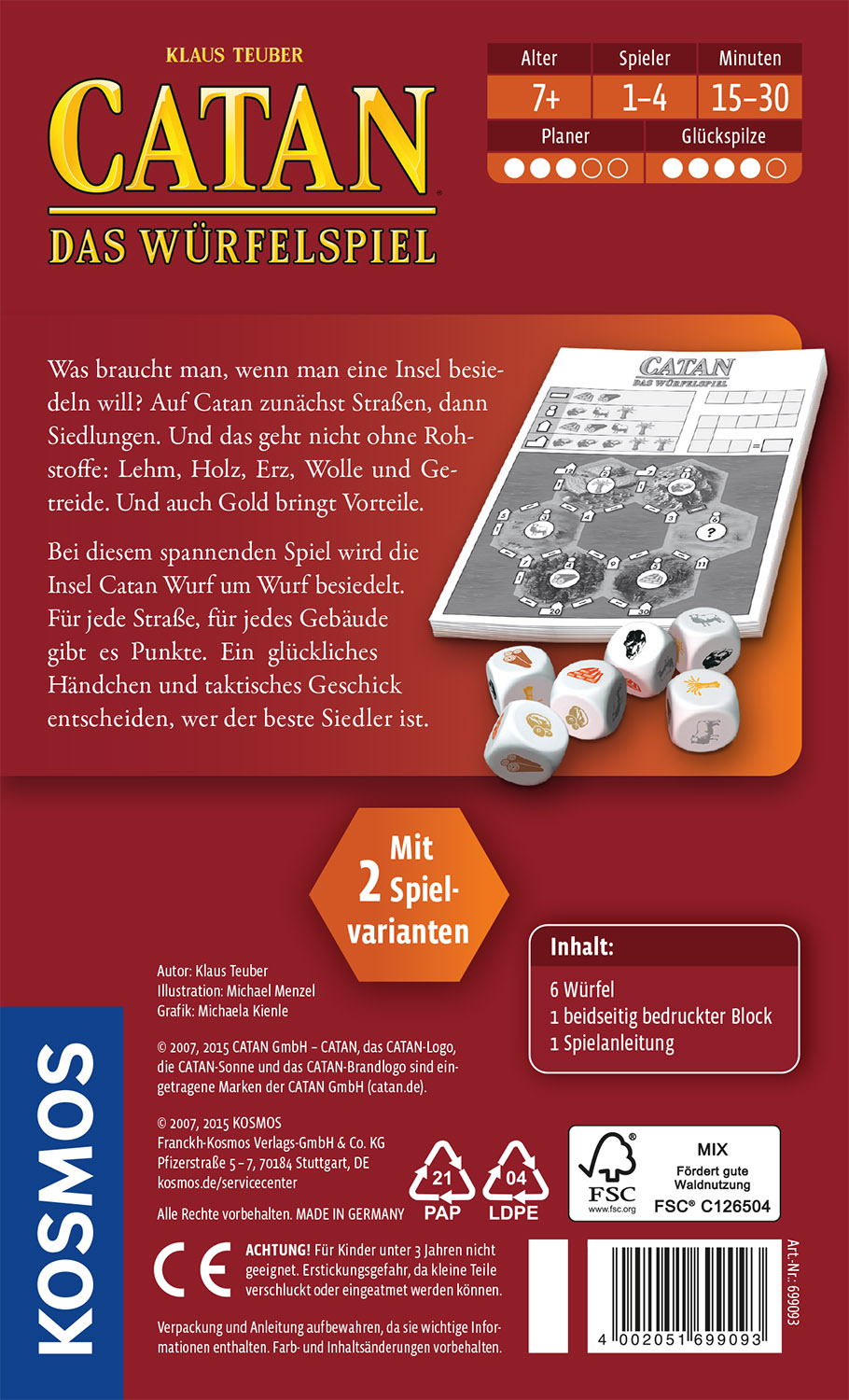 Was braucht man, wenn man eine Insel besiedeln will? Auf Catan zunächst Straßen, dann Siedlungen. Und das geht nicht ohne Rohstoffe: Lehm und Holz, Erz und Wolle. Getreide braucht man zum Essen - und wer viel Glück hat, findet Gold. Bei diesem lockeren Würfelspiel wird die Insel Catan Wurf um Wurf besiedelt. Für jede Straße, für jedes Gebäude gibt es Punkte. Ein glückliches Händchen und taktisches Geschick entscheiden, wer der beste Siedler ist. Hier kann jedem der große Wurf gelingen! Für 1 - 4 Spieler ab 7 Jahren. Spieldauer: ca. 20 Minuten.