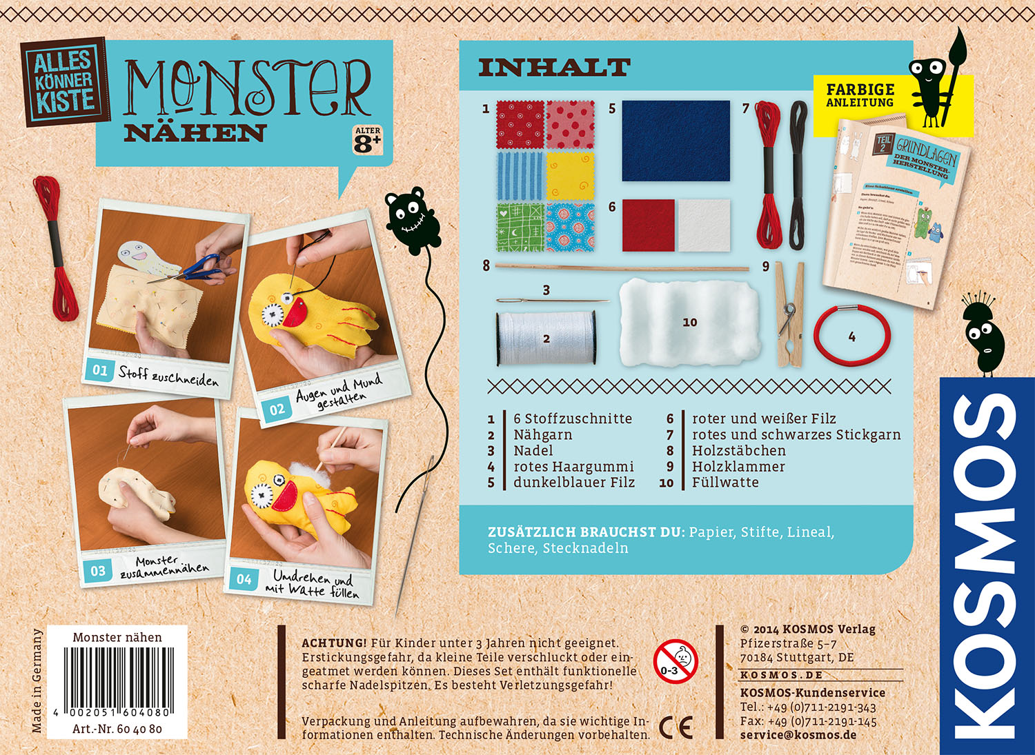 Do it yourself: Lieblings-Monster nähen – dank der AllesKönnerKiste von Kosmos sind der Kreativität keine Grenzen gesetzt. Ein ideales Nähset für Anfänger Hochwertiges Material: Mit vielen Stoffen und Bastelmaterial individuelle Monsterfreunde kreieren – zum Spielen, Liebhaben oder Verschenken Ausführliche Schritt-für-Schritt-Anleitung: Das liebevoll gestaltete Anleitungsheft ist komplett illustriert und führt Sie und Ihr Kind anschaulich durch das Bastel-Projekt Für Einsteiger geeignet: Die Grundtechniken des Nähens werden genau und leicht verständlich erklärt – so erleben auch Anfänger wunderbare Bastel-Erfolge Das ideale Geschenk-Set: Die AllesKönnerKisten sind Bastel-Set enthalten alle Materialien, um sofort loszulegen. Perfekt geeignet für Bastelnachmittage in der Familie und Kindergeburtstage! Mit diesem Kreativ-Set kann jeder sein ganz persönliches Lieblings-Monster herstellen. Dafür werden die Grundtechniken des Nähens und die verschiedenen Gestaltungsmöglichkeiten im Anleitungsheft genau erklärt. So entstehen aus der Vielzahl der mitgelieferten Stoffe und Materialien ganz individuelle Monsterfreunde, zum Spielen, Liebhaben oder Verschenken.