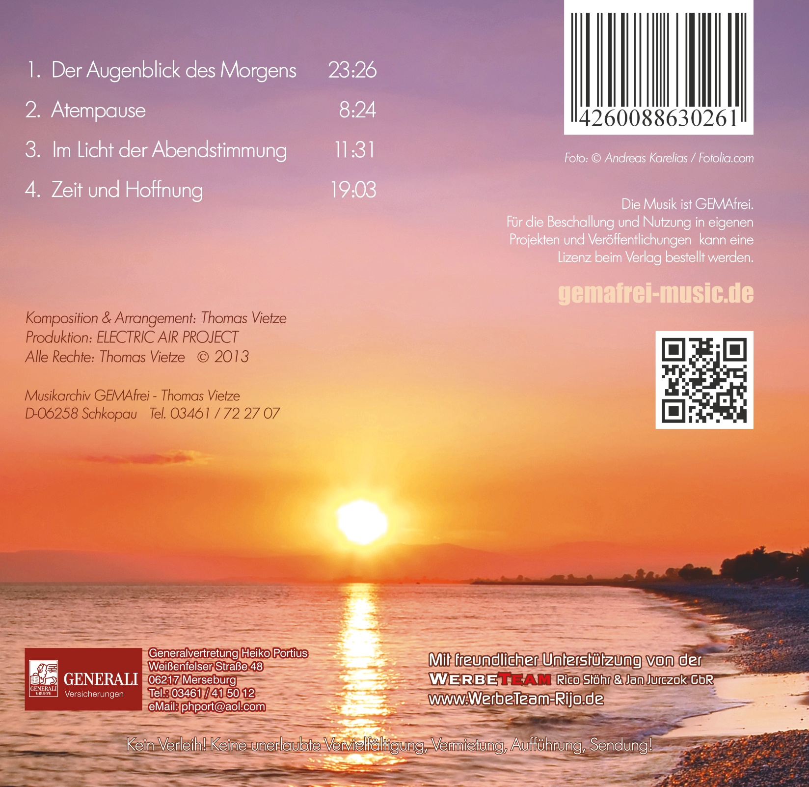 CD-Inhaltsangabe: 1. Der Augenblick des Morgens (23:26) 2. Atempause (8:24) 3. Im Licht der Abendstimmung (11:31) 4. Zeit und Hoffnung (19:03) Gesamtspielzeit: 62:30 Hörprobe beim Verlag unter: gemafrei-music.de/demo.htm Lizenzen für Beschallung und eigene Veröffentlichungen erhältlich. (GEMAfrei)