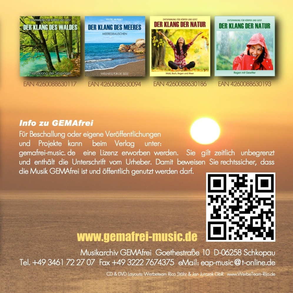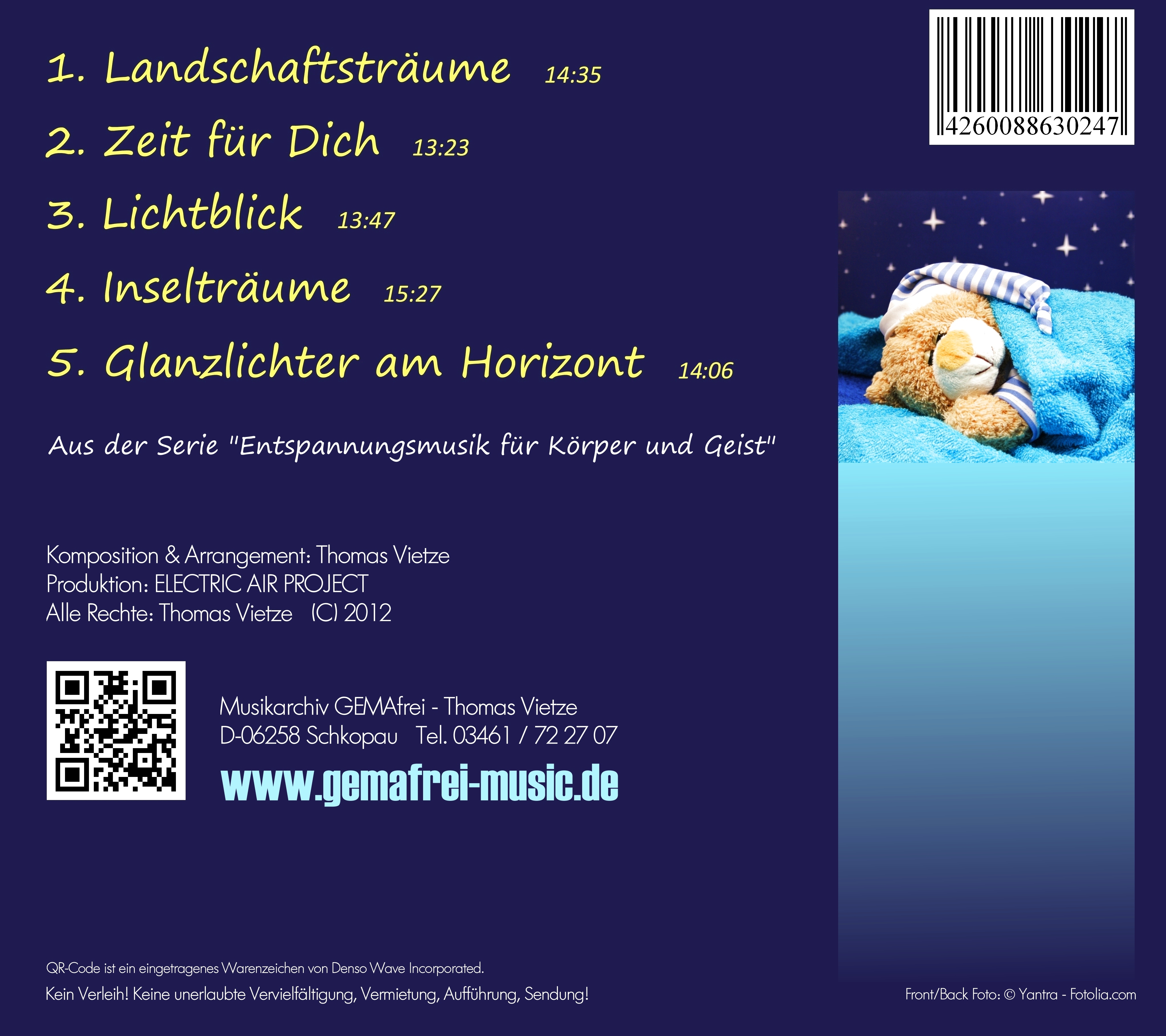 CD-Inhaltsangabe: 1. Landschaftsträume (14:35) 2. Zeit für Dich (13:23) 3. Lichtblick (13:47) 4. Inselträume (15:27) 5. Glanzlichter am Horizont (14:06) Gesamtspielzeit: 71:30 Minuten Hörproben beim Verlag unter: gemafrei-music.de/demo.htm Lizenzen für Beschallung und eigene Veröffentlichungen erhältlich. (GEMAfrei)