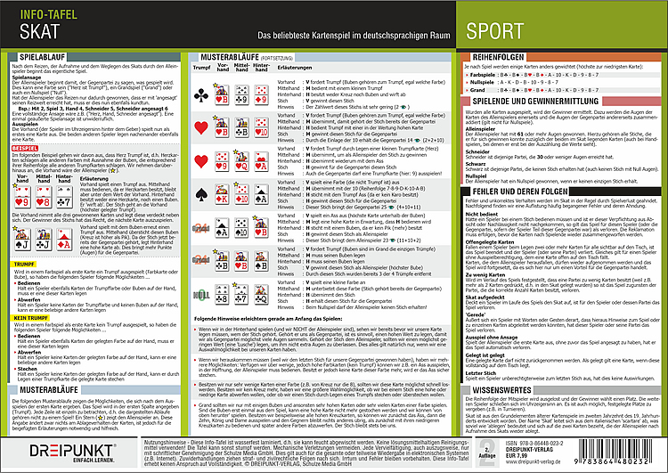 Skat ist das beliebteste Kartenspiel im deutschsprachigen Raum. Es wird seit Generationen gespielt und übt eine unglaubliche Faszination aus. Mit dieser Info-Tafel können Sie Skat spielend leicht von den Grundlagen über den Spielablauf bis zu den Feinheiten erlernen. Viele Beispiele und Abbildungen erleichtern dabei das Verständnis. Die zweiseitige Info-Tafel ist wasserfest laminiert und hält so auch über Jahre allen Belastungen stand.