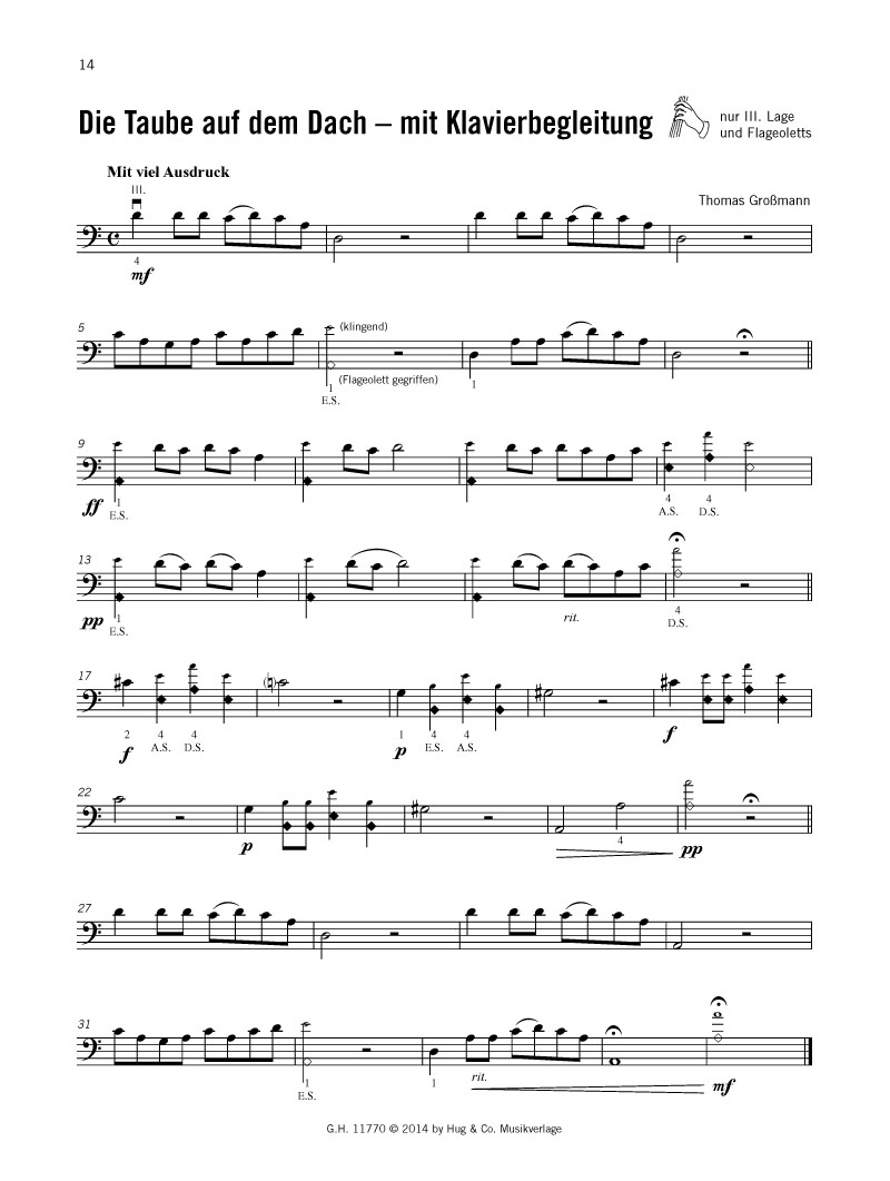 Barock, Klassik, RomantikAndante grazioso (aus KV 331) - Wolfgang Amadeus Mozart Åses Tod (aus „Peer-Gynt-Suite 1“) - Edvard Grieg Bourrée (aus „Lautensuite” BWV 996) - Johann Sebastian Bach Cadenza zum 1. Satz „Allegro moderato“ (aus dem „Konzert für Kontrabass“ F-Dur) - Antonio Capuzzi Etüde Nr. 5 - Franz Simandl Etüde Nr. 11 - Franz Simandl Etüde Nr. 17 - Franz Simandl Fröhlicher Landmann* - Robert Schumann Kleines Präludium BWV 939 - Johann Sebastian Bach Komm, lieber Mai - Wolfgang Amadeus Mozart Allegro (aus „Sonate für Violoncello“ e-Moll, 1. Satz) - Benedetto Marcello Largo (aus „Sonate g-Moll“, 1. Satz) - Henry Eccles Ungarischer Tanz Nr. 5 - Johannes Brahms - Pop, Jazz, FilmmusikAs Tears Go By - Rolling Stones C Jam Blues* - Duke EllingtonDu hast’n Freund in mir - Film: „Toy Story“ Fever* - Elvis Presley/Peggy Lee Go Down, Moses* - Golden Gate Quartet Killer Joe - Art Blakey Let’s Groove* - Earth, Wind & Fire Probier’s mal mit Gemütlichkeit - Film: „Das Dschungelbuch“ Moonlight Serenade - Glenn Miller Morning Has Broken* - Cat Stevens Over The Rainbow - Film: „The Wizard Of Oz“ Sunny* - Boney M./Stevie Wonder - VolksliedAbend wird es wieder*Auf einem Baum ein Kuckuck saßA casinha pequeninaDona nobis pacem*Es führt über den Main*Es klappert die Mühle am rauschenden Bach*Himmel und Erde müssen vergehn*Irische SegenswünscheLobe den HerrenNun wollen wir singen das AbendliedWinde wehn, Schiffe gehn* - WeihnachtenEs kommt ein Schiff, geladen*Maria durch ein’ Dornwald gingMorgen kommt der Weihnachtsmann*O Tannenbaum*Rudolph, The Rednosed ReindeerWe Wish You A Merry Christmas*White Christmas *) auch für den Gruppenunterricht bzw. für Mehrfachbesetzungen geeignet