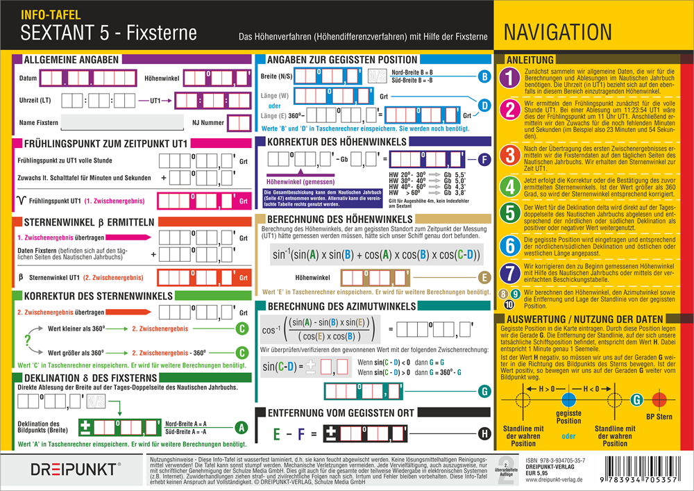 | Schlagworte | Astronomische Navigation • Binnen • Boot fahren • Dreipunkt • Dreipunkt-Verlag • Höhendifferenz • Höhen-Differenz • Höhendifferenzverfahren • Höhen-Differenzverfahren • Info Tafel • Info-Tafel • Info Tafel Set • Info-Tafel-Set • Mittagsbreite • Motorboot • Navigation • Navigation Mond • Navigation; Nonbooks • Navigation Sonne • Navigationssterne • Oktant • Position auf See • Positionsbestimmung • SBF • See • Seekarte • Segeln • Sextant • Sextant (Nonbooks) |