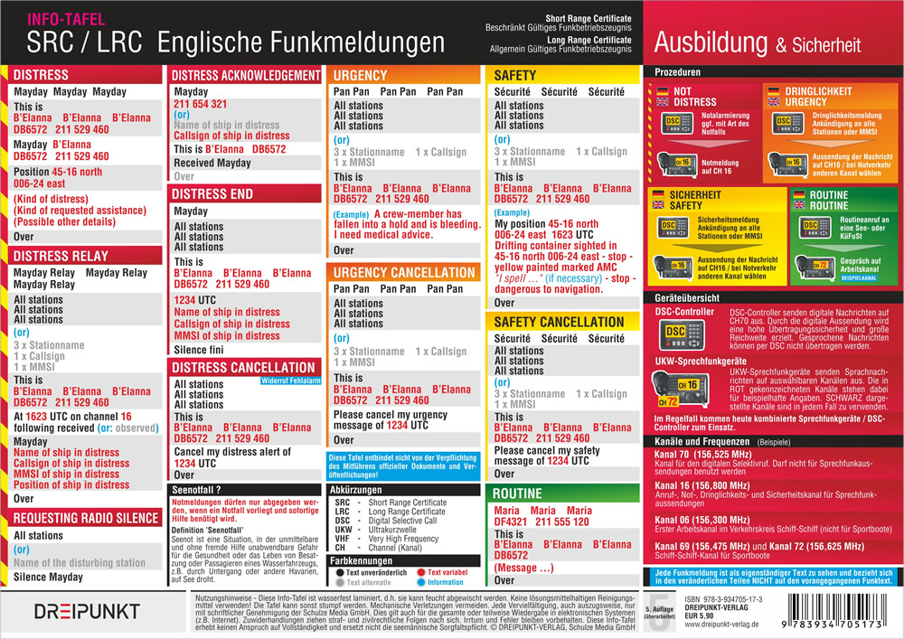 | Schlagworte | Allgemeines Funkbetriebszeugnis (LRC) • Beschränkt Gültiges Funkbetriebszeugnis (SRC) • Binnen • Boot fahren • Dreipunkt • Dreipunkt-Verlag • Frequenzen • Funkmeldungen • Funksysteme • Info Tafel • Info-Tafel • Info Tafel Set • Info-Tafel-Set • Long Range Certificate • LRC • Motorboot • Notsignal • SBF • Schiff • See • Seefunk • Seenot • Seenotfall • Seenotsignale • Seenotsignalmittel; Nonbooks • Segeln • Short Range Certificate • SRC • UBI • UKW-Funk • Verhalten in Not |