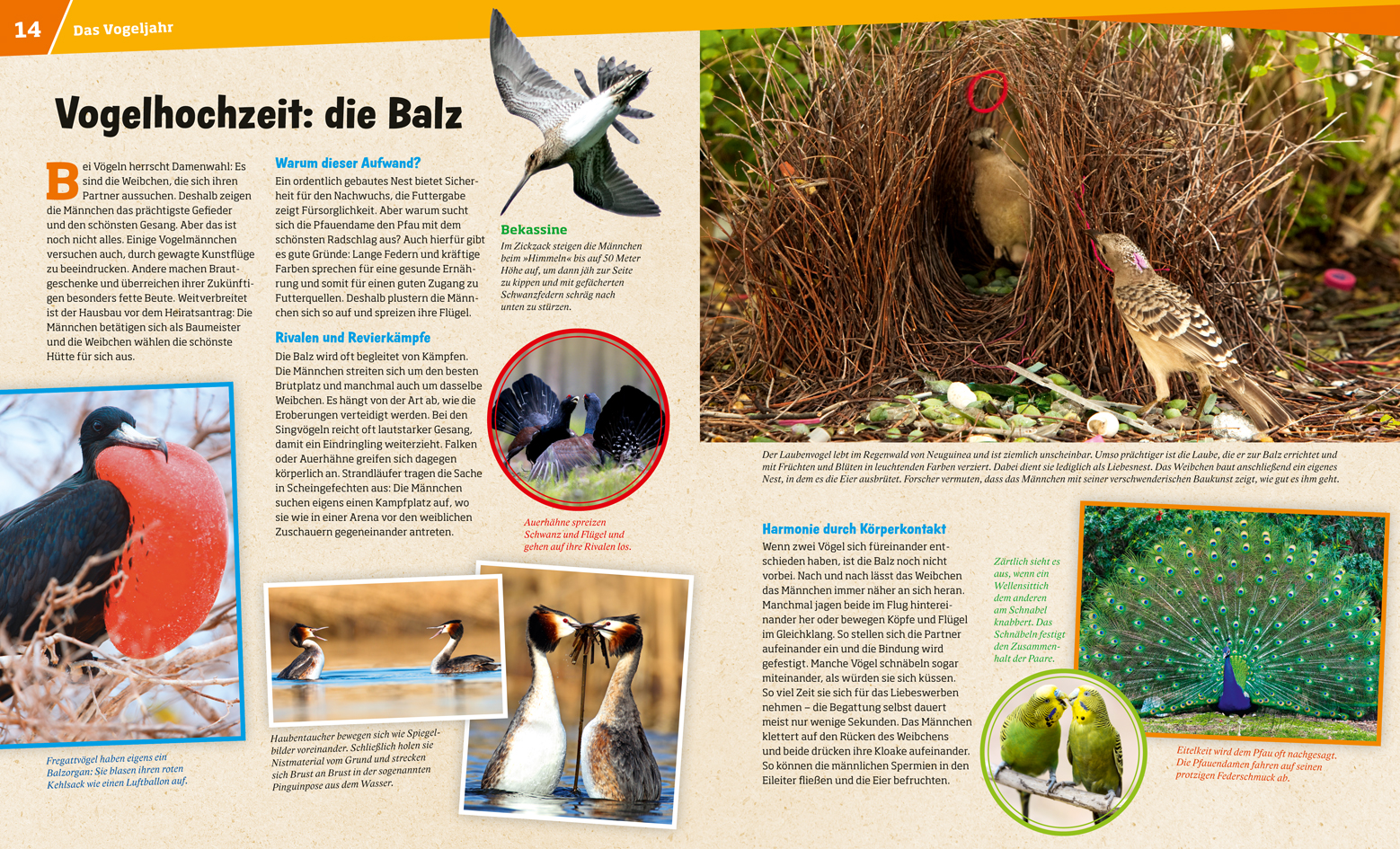 Bei den Vögeln herrscht Damenwahl: Es sind die Weibchen, die sich ihren Partner aussuchen. Deshalb zeigen die Männchen das prächtigste Gefieder und den schönsten Gesang. Aber das ist noch nicht alles. Einige Vogelmännchen versuchen auch, durch gewagte Kunstflüge zu beeindrucken. Andere machen Brautgeschenke und überreichen ihrer Zukünftigen besonders fette Beute. Weitverbreitet ist der Hausbau vor dem Heiratsantrag: Die Männchen betätigen sich als Baumeister und die Weibchen wählen die schönste Hütte für sich aus.