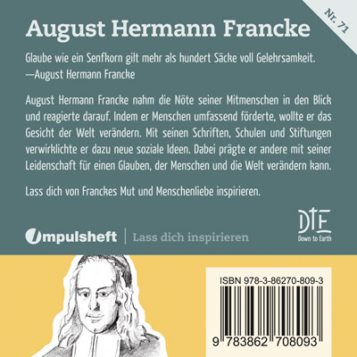 August Hermann Francke nahm die Nöte seiner Mitmenschen in den Blick und reagierte darauf. Indem er Menschen umfassend förderte, wollte er das Gesicht der Welt verändern. Mit seinen Schriften, Schulen und Stiftungen verwirklichte er dazu neue soziale Ideen. Dabei prägte er andere mit seiner Leidenschaft für einen Glauben, der Menschen und die Welt verändern kann.