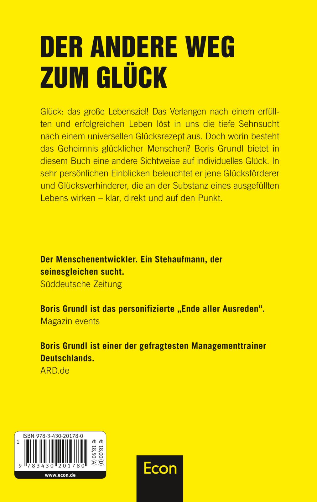 Glück: das große Lebensziel! Das Verlangen nach einem erfüllten und erfolgreichen Leben löst in uns die tiefe Sehnsucht nach einem universellen Glücksrezept aus. Doch worin besteht das Geheimnis glücklicher Menschen? Boris Grundl bietet in diesem Buch eine andere Sichtweise auf individuelles Glück. In sehr persönlichen Einblicken beleuchtet er jene Glücksförderer und Glücksverhinderer, die an der Substanz eines ausgefüllten Lebens wirken - klar, direkt und auf den Punkt.