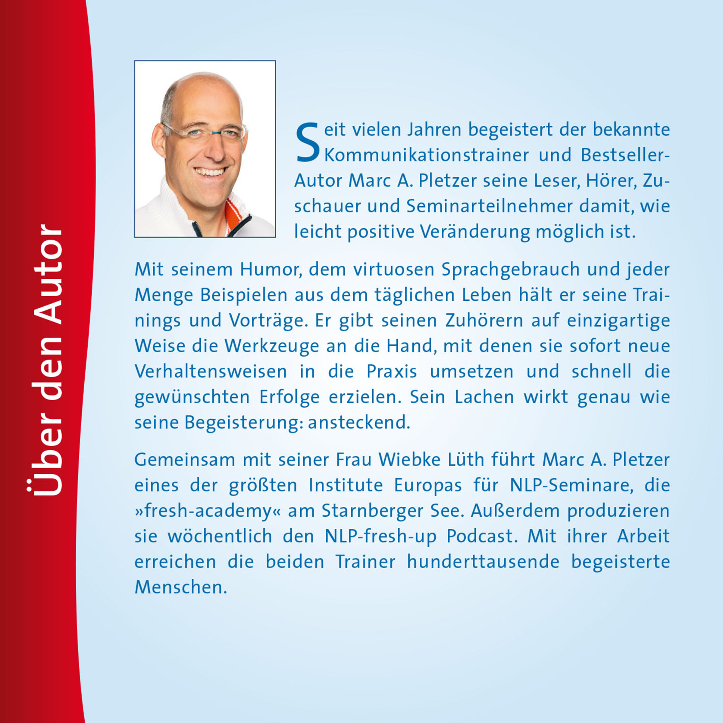 Marc A. Pletzer ist einer der besten Kommunikationstrainer der Welt, er wurde von Richard Bandler persönlich zum NLP Master-Trainer ernannt. Er gibt NLP-Seminare an der Pletzer Academy und leitet den Verlag Blue Planet AG in der Schweiz, der sich auf die Produktion und Vermarktung von Hörbüchern, Entspannungs-Meditationen und Videos sowie Büchern spezialisiert hat. Vor seiner Arbeit als Kommunikationstrainer hat Marc A. Pletzer viele Jahre als freier Journalist für zahlreiche Magazine, Fachzeitschriften, öffentlich-rechtliche Radio- und TV-Sender gearbeitet. Sein Buch „Emotionale Intelligenz – Das Trainingsbuch“ aus dem Haufe Verlag war über ein halbes Jahr lang auf der Top-ten-Bestsellerliste der Financial Times Deutschland. Marc Pletzer produziert unter anderem den kostenlosen wöchentlichen Podcast Marcs kleine Welt.