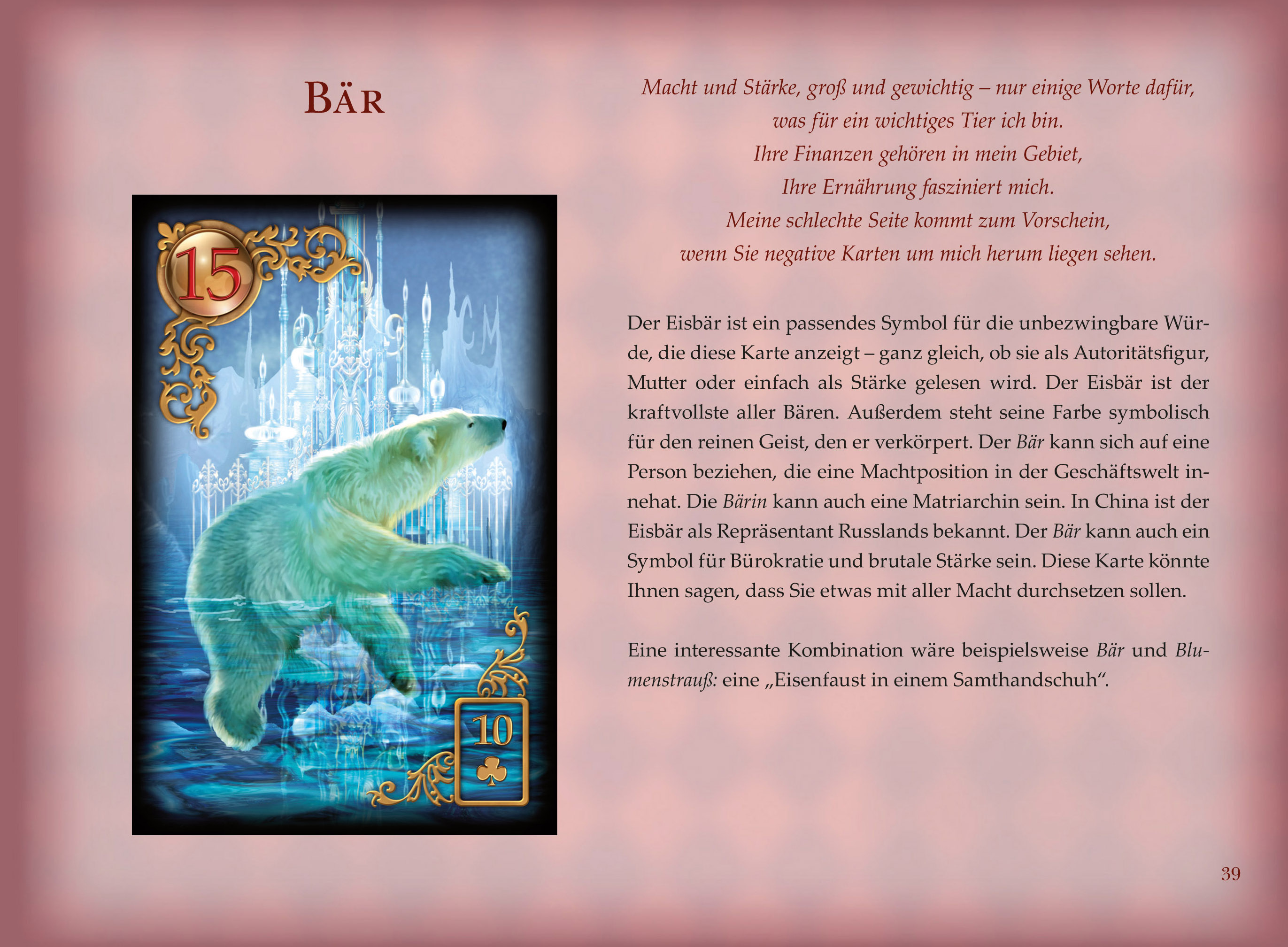 Ciro Marchetti, der die Gilded Reverie Lenormandkarten als Künstler gestaltet hat, präsentiert zu jeder der 36 Karten wissenswerte Hintergründe und praktische Bedeutungen für das Kartenlegen. In der Einleitung des Buches erzählt er, wie sein "Gilded Reverie" entstanden ist, ein weiteres gibt Einblick in die Geschichte der Lenormandkarten, beginnend im 18. Jahrhundert. Nach den Erklärungen zu jeder einzelnen Karte folgt ein sehr ausführliches Kapitel zu zahlreichen Legemustern und welche Deutung sich aus den Beziehungen der Karten untereinander ergibt.