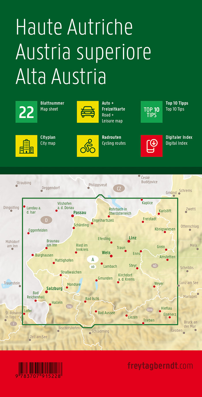 Neben der übersichtlichen Gestaltung verfügt die Straßenkarte Oberösterreich 1:150.000 über zahlreiche Zusatzinformationen wie z.B. Straßenbeschaffenheit, Sehenswürdigkeiten, Campingplätze und diverse Innenstadtpläne. Mit dem umfangreichen Ortsregister gelingt zudem eine rasche Orientierung. Die "Top 10 Tips" - Reihe bietet ein kleines Beiheft, in dem die zehn wichtigsten Sehenswürdigkeiten in mehreren Sprachen kurz beschrieben sind. (Sprachen: Deutsch, Englisch, Französisch, Italienisch) Top 10 Tips Sehenswürdigkeiten, Top Citypläne, Radrouten; freytag & berndt Autokarten sind für viele Länder und Regionen weltweit erhältlich.