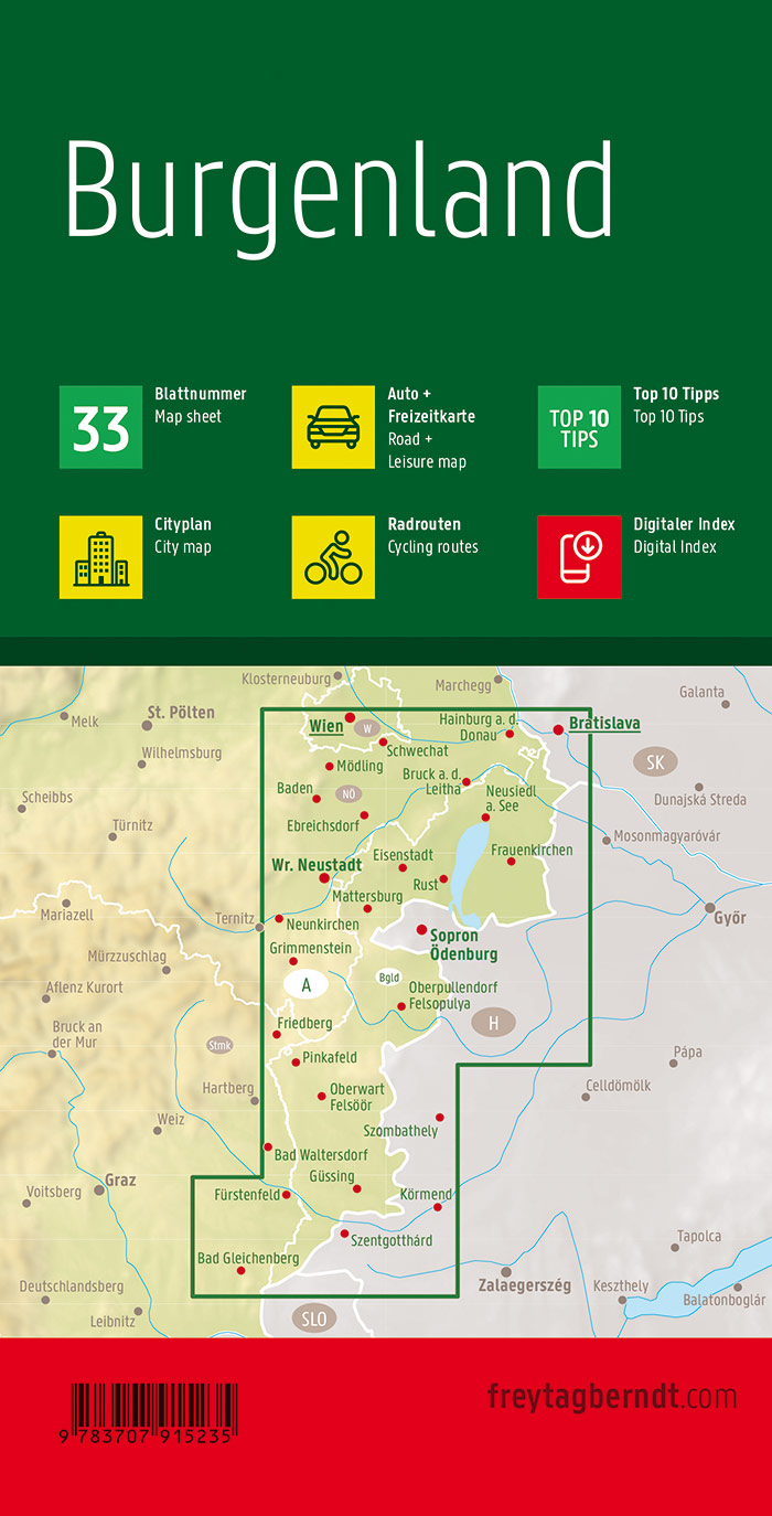 freytag & berndt Autokarten sind für viele Länder und Regionen weltweit erhältlich. Neben der übersichtlichen Gestaltung verfügen die Straßenkarten über zahlreiche Zusatzinformationen wie z.B. Straßenbeschaffenheit, Sehenswürdigkeiten, Campingplätze und diverse Innenstadtpläne. Mit dem umfangreichen Ortsregister gelingt zudem eine rasche Orientierung. Die "Top 10 Tips" - Reihe bietet ein kleines Beiheft, in dem die zehn wichtigsten Sehenswürdigkeiten in mehreren Sprachen kurz beschrieben sind. (Sprachen: Deutsch, Englisch, Französisch, Italienisch) Top 10 Tips Sehenswürdigkeiten, Top Citypläne von Eisenstadt, Güssing, Jennersdorf, Neusiedl am See, Oberpullendorf, Oberwart und Rust; Radrouten;