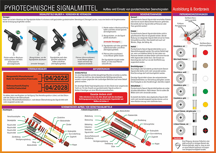 Gerade bei häufig wechselnden Crews, z.B. auf Charter-Yachten, ist es wichtig, dass die Crew eine gute Einweisung in die zur Verfügung stehenden pyrotechnischen Signalmittel erhält. Da jedoch nicht immer jedes Seenotsignal zur Erklärung zur Hand ist, kann hierfür diese Info-Tafel verwendet werden. Sie finden die wichtigsten Seenotsignalmittel mit einer fotorealistischen Abbildung und einer genauen Erklärung zum Einsatzgebiet sowie Hinweisen zur Verwendung. Darüber hinaus ist eine schematische Darstellung zum korrekten Einsatz enthalten. Ein eigener Abschnitt widmet sich der Signalpistole Kal. 4 sowie der dazugehörigen Munition. Zusätzlich befinden sich auf der Info-Tafel detaillierte dreidimensionale schematische Abbildungen zum Aufbau ausgewählter Seenotsignalmittel. Folgende Signalmittel und Verfahren werden dargestellt:- Fallschirmsignalraketen- Rauchsignale (Hand)- Handfackeln- Rauchsignale (Wasser)- Signalpistole Kal. 4- Öffnen und Laden- Spannen und Abfeuern- Verhalten bei Versagern- Patronenbezeichnungen (Rändelschemata)- Sicherheitshinweise- Infos zu allen Signalmitteln- Einsatzgebiete- Einsatzdaten- HandhabungDie Info-Tafel ist beidseitig bedruckt und wasserfest und unzerreißbar laminiert. So hält sie auch dem rauen Bordalltag stand und kann auf jedem Törn mitgenommen werden.