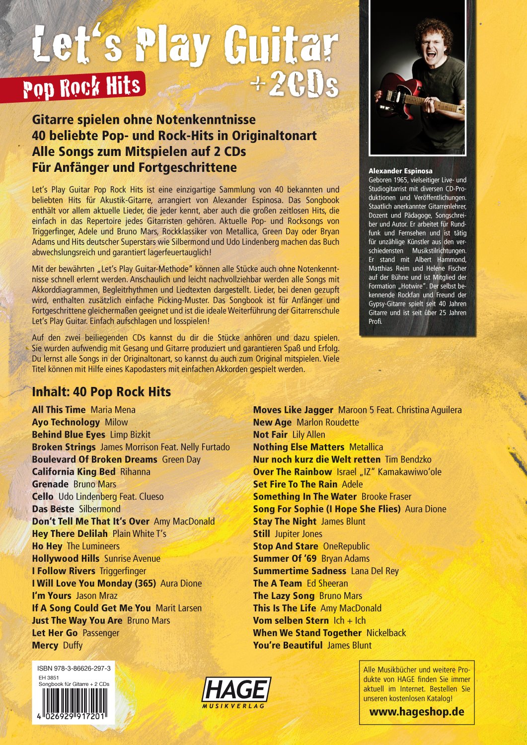 Let's Play Guitar Pop Rock Hits ist eine einzigartige Sammlung von 40 bekannten und beliebten Hits für Akustik-Gitarre, arrangiert von Alexander Espinosa. Das Songbook enthält vor allem aktuelle Lieder, die jeder kennt, aber auch die großen zeitlosen Hits, die einfach in das Repertoire jedes Gitarristen gehören. Aktuelle Pop- und Rocksongs von Triggerfinger, Adele und Bruno Mars, Rockklassiker von Metallica, Green Day oder Bryan Adams und Hits deutscher Superstars wie Silbermond und Udo Lindenberg machen das Buch abwechslungsreich und garantiert lagerfeuertauglich!