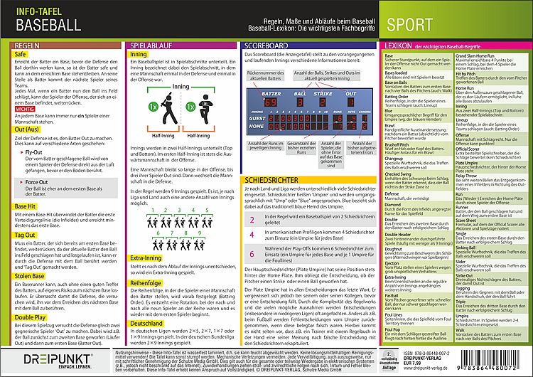 Neue, überarbeitete und erweiterte Version: Jetzt auf zwei Seiten, mit Lexikon der wichtigsten Baseball-Begriffe!Baseball ist DER Vater- und Sohn-Sport in den Vereinigten Staaten. Baseball wird von der Highschool bis zur Profiliga gespielt. In Deutschland hat sich eine lebhafte Baseball-Szene entwickelt und der Sport findet rasanten Zulauf. Praktisch jeder kann Baseball erlernen. Mit dieser Info-Tafel werden alle wichtigen Regeln, Ausrüstungsgegenstände und Spielweisen erläutert. Diese Tafel widersteht auch den rauhen Bedingungen auf dem Sportplatz. Sie ist ein unentbehrlicher Helfer bei dem Einstieg in eine faszinierende Sportart.Aus dem Inhalt:- Spielfeld & Spieler- Schläger- Handschuh- Ball- Helm- Regeln- Spielablauf- Scoreboard- Schiedsrichter- Lexikon der wichtigsten Baseball-Begriffe Tipp: Nimm diese Tafel einfach mit zum Spiel! Robust und wasserfest laminiert, hält die Tafel dabei auch den widrigsten Bedingungen stand.