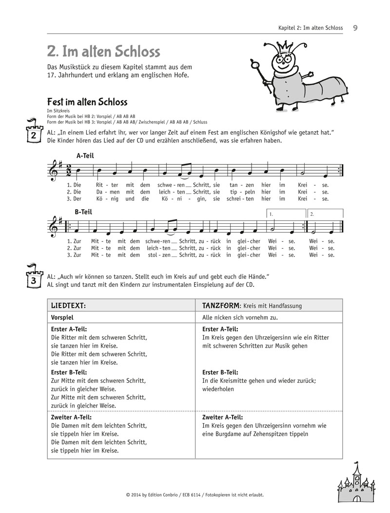 Clowns und bunte LuftballonsGegensätze erfassen und ausdrücken - Clowns und bunte LuftballonsFreie und gebundene AktionenBewegung in ZeitlupeBewegungsbegleitungMusizieren auf LuftballonsIm alten SchlossGrundschlag erfassen - Fest im alten SchlossRaumformen gehen - Am SchlossbrunnenLied und Tanz verbinden - Im SchlossgartenTanzformen kennenlernen: Kreis, Schlange, Tor - SchlossmusikInstrumentalbegleitung spielenAm LagerfeuerZweiteilige Form der Musik erfassen - Am LagerfeuerArtikulation - Gedicht vom FeuerTemposteigerung - Lied vom FeuerLied vom FeuerPapierklängeVon Schneeflocken und EiskristallenRhythmischer Kreislauf des Schnees - Von Schneeflockenn und EiskristallenKörperspannung, leichte und fließende Bewegungen, Bewegungssteuerung, KraftdosierungFühren und FolgenMusizieren auf GläsernMit dem Lasso unterwegsPhrasen empfinden, Form erfassen - CowboymusikGrundschlag und 4/4-Takt empfinden - Geschichten aus dem Wilden WestenGrafische NotationStimmaktionenInstrumentalbegleitungIm ZauberwaldGegensätze in Bewegung und Musik - Im ZauberwaldPosen erfinden und spiegelnMalen zur MusikArtikulationInstrumental-ImprovisationFußball, Eislauf, RudernForm erfassen - Lied vom FußballspielenDialogische Phrasen empfinden - Fußball, Eislauf, RudernRhythmisch-metrische Bewegungen - Lied vom SchlittschuhlaufenKörperkoordination, Gleichgewicht, Geschicklichkeit - Lied vom RudernSprechrhythmen - Lied vom Fußball, Eislauf, RudernLiederMach mal PausePhrasen empfinden - Kurze Pausen im 4/4Körperspannung halten - Lange Pausen im 4/4Bewegungen umschalten - Tiere erstarrenTakt empfinden im 4/4 und 6/8SchlägelspielAlte Uhren auf dem DachbodenGrundschlag empfinden - Tiere auf dem DachbodenTaktwechsel 3/4 und 2/4 - Drei UhrenRondo - Kinder auf dem Dachbodenunterschiedliche Fortbewegungsartenrhythmisch-metrischeBewegungen im Verhältnis 1:2:4LiederInstrumentalspielDrei Geschichten aus ChinaForm erfassen - Drei Geschichten aus ChinaFreie Bewegungsgestaltung und gebundener Tanz - Drachenfest-OrchesterVerkörperungRhythmische Begleitung mit InstrumentenInstrumental-ImprovisationMacht alle mitWahrnehmen und Nachahmenin Bewegung, mit der Stimme und mit Körperklängen - Macht alle mitGrundschlag und Phrasen empfinden - MitmachliedForm erfassen - MitmachklängeLiederInstrumentalbegleitungKopiervorlagenEinzelaktionen