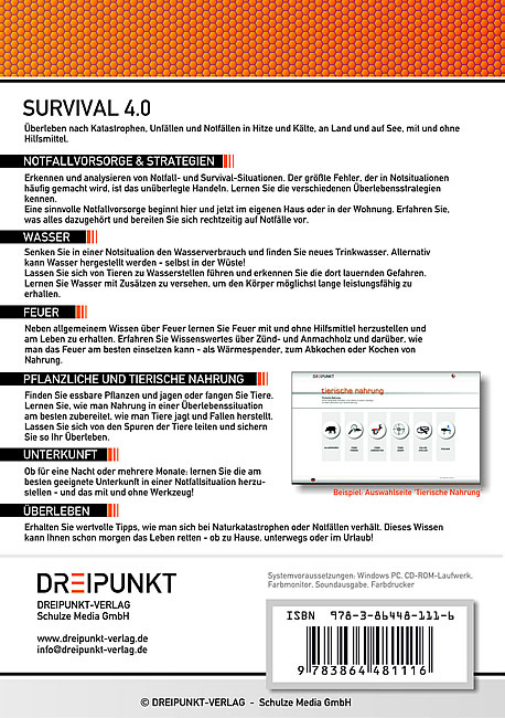 | Schlagworte | Dreipunkt • Dreipunkt-Verlag • Jagen • Notfall • Notfallvorsorge • Notsituation • Survival • Survival Technik • Survivaltechniken • Tipps • Tricks • Überleben • Überleben in der Wildnis • Überlebenstechniken • Wassergewinnung • Wildnis |