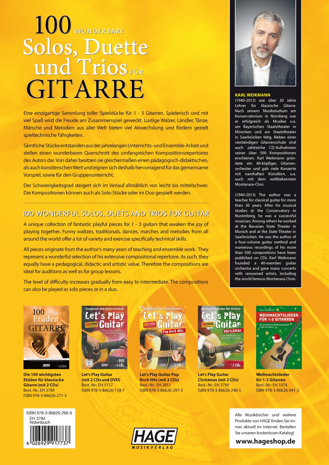 Karl Weikmann (1940-2013) war über 30 Jahre Lehrer für klassische Gitarre. Nach seinem Musikstudium am Konservatorium in Nürnberg war er erfolgreich als Musiker u.a. am Bayerischen Staatstheater in München und am Staatstheater in Saarbrücken tätig. Neben einer vierbändigen Gitarrenschule sind auch zahlreiche CD-Aufnahmen seiner über 500 Kompositionen erschienen. Karl Weikmann grün-dete ein 40-köpfiges Gitarrenorchester und gab viele Konzerte mit namhaften Künstlern, u.a. auch mit dem weltbekannten Montanara-Chor.